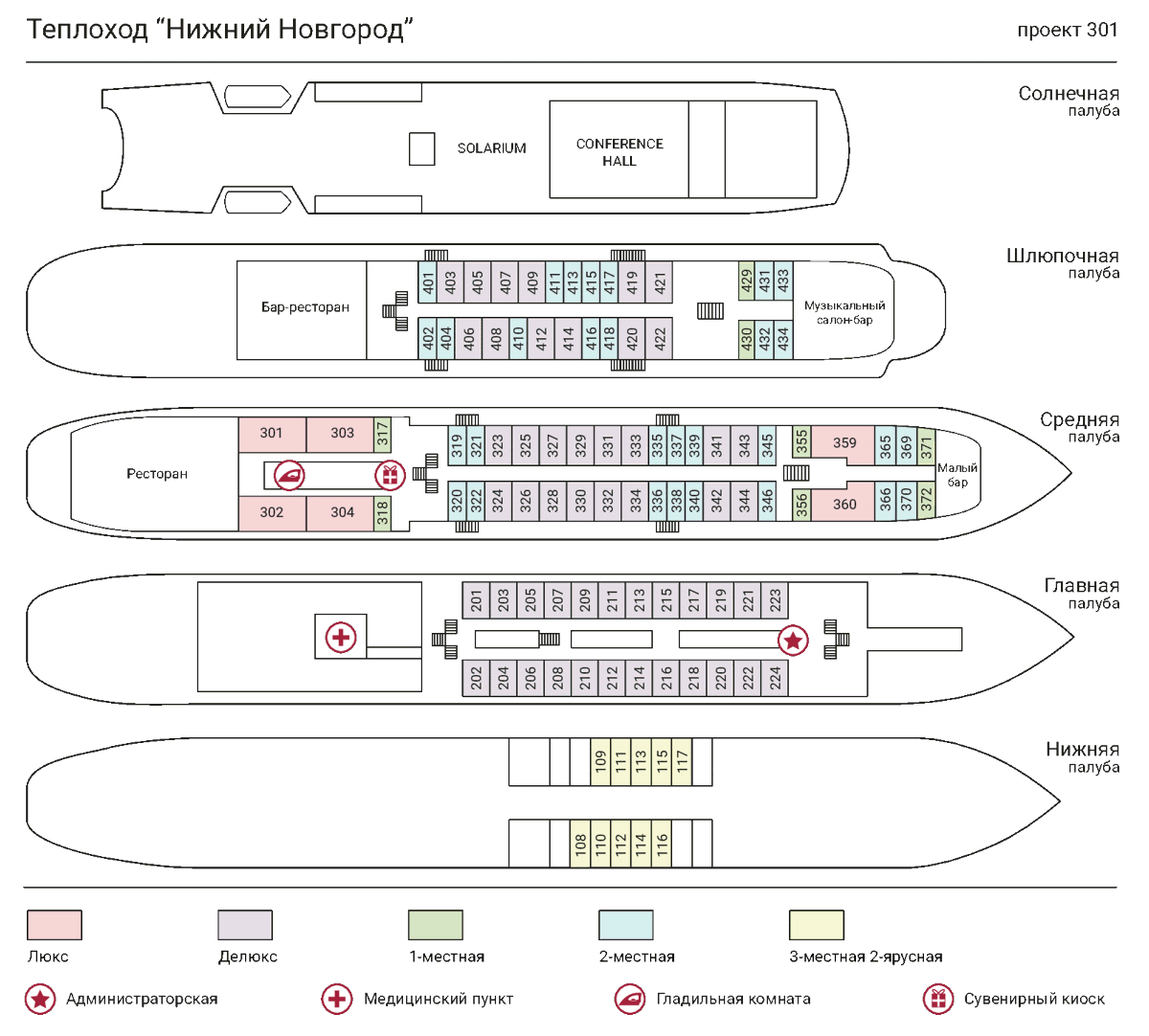 Каюты №: 317, 318, 355, 356, 371, 372.