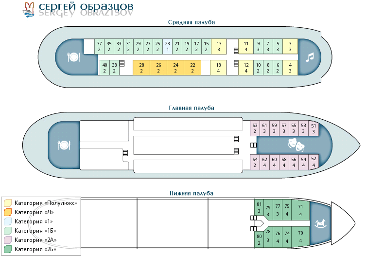 Для размещения туристов предусмотрены 1-, 2-х, 3-х и 4-х местные каюты на средней, главной и нижней палубах.