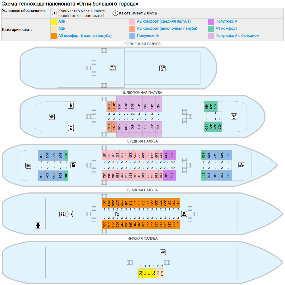 В каютах 406, 410, 413–416 возможно размещение третьего человека на дополнительном спальном – тахта.