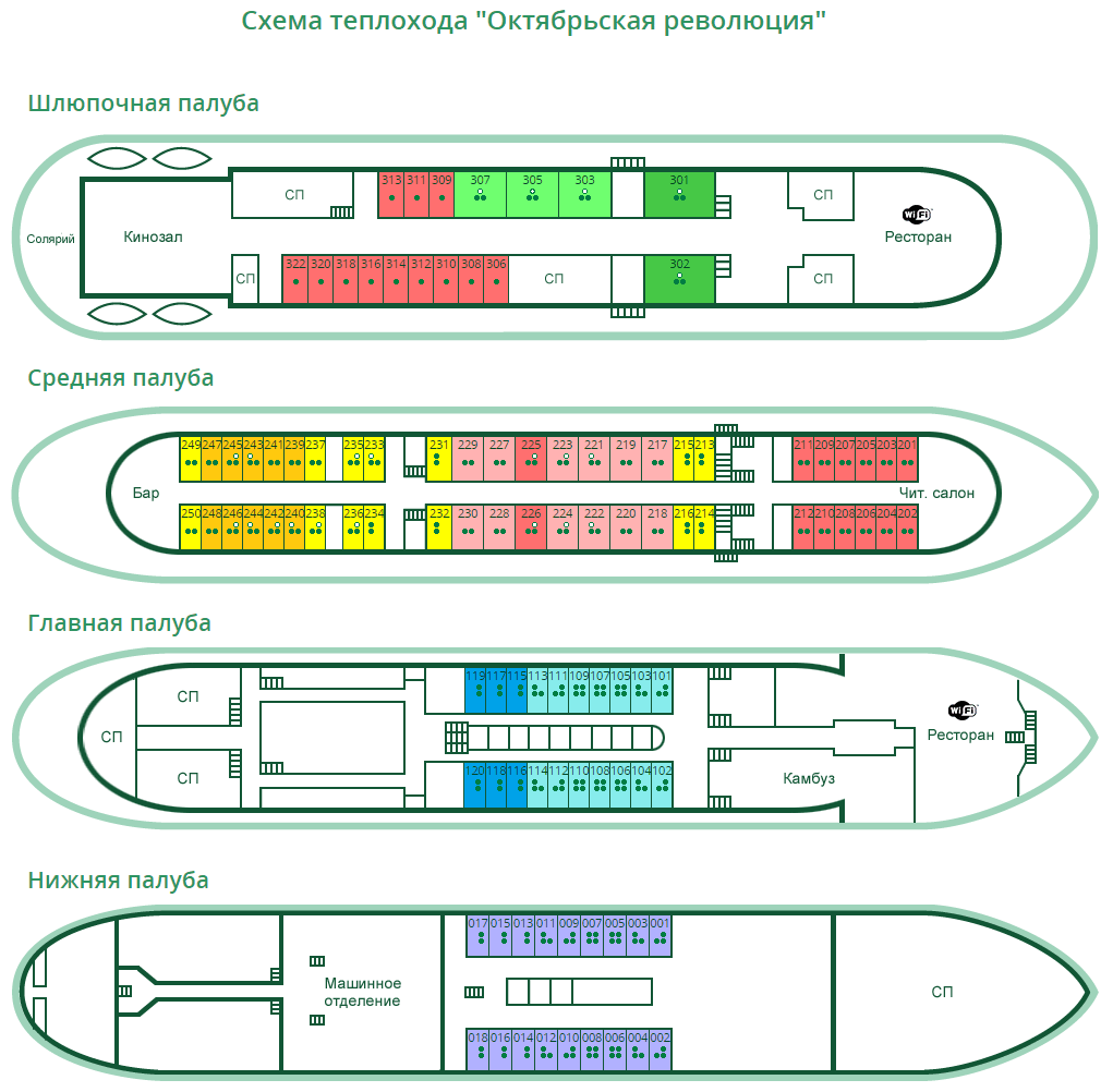 К вашим услугам: 2-х местные каюты без удобств, 3-х и 4-х местные каюты с умывальником (гор/холод вода), 1, 2-х, 3-х местные каюты с удобствами (душ, санузел, холодильник, кондиционер), каюты класса "Полулюкс" (душ, санузел, холодильник, кондиционер) и "Люкс" (все удобства, видеодвойка, кондиционер, раскладывающийся диван).