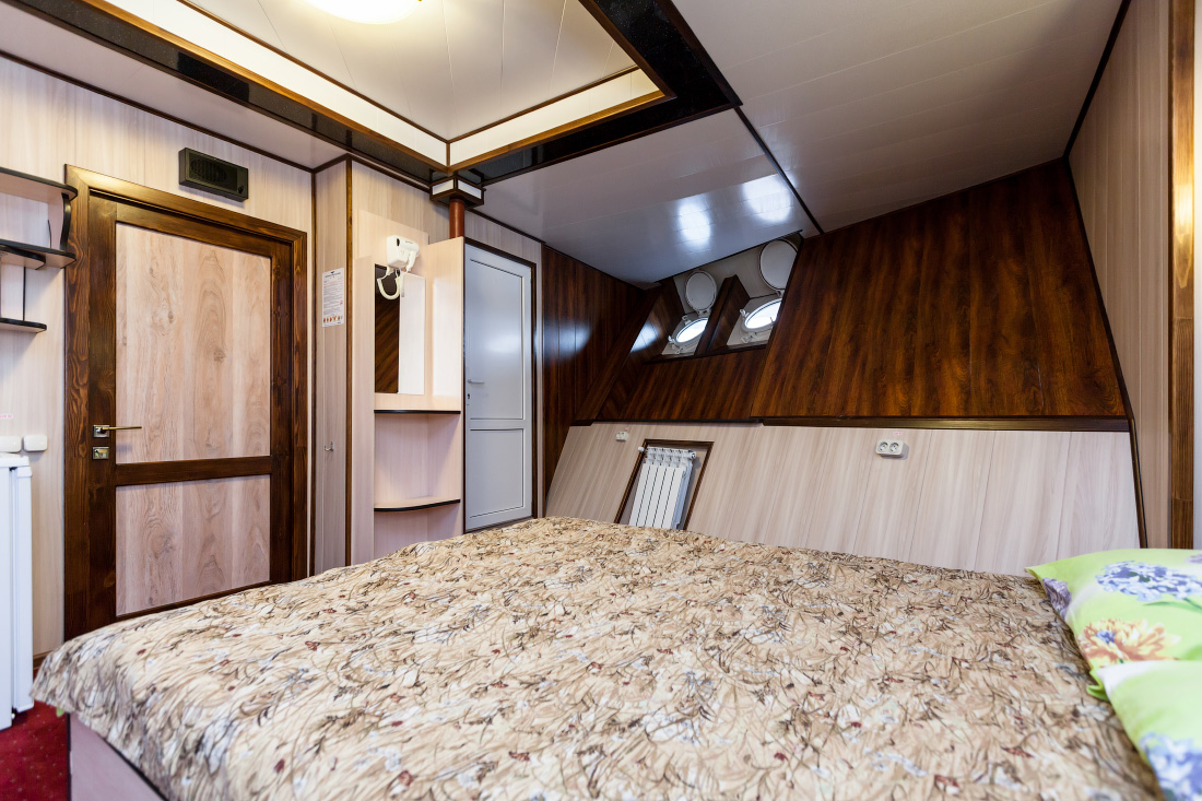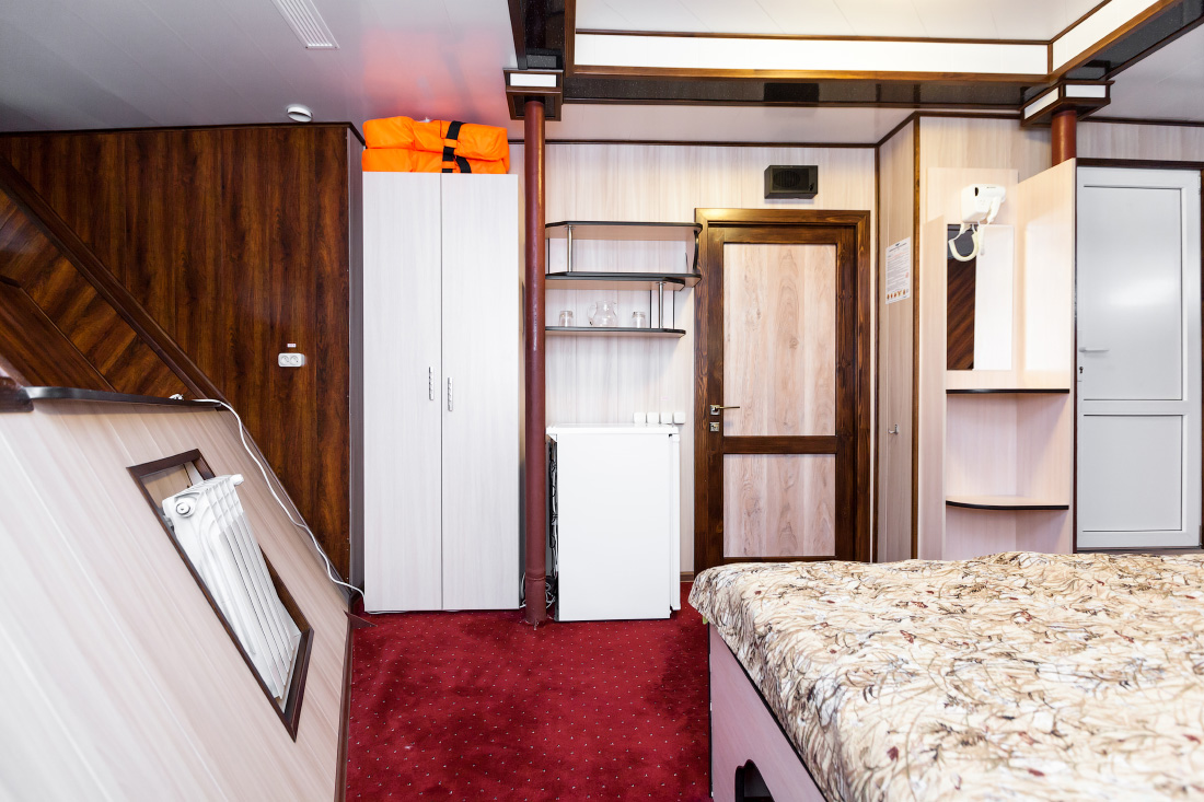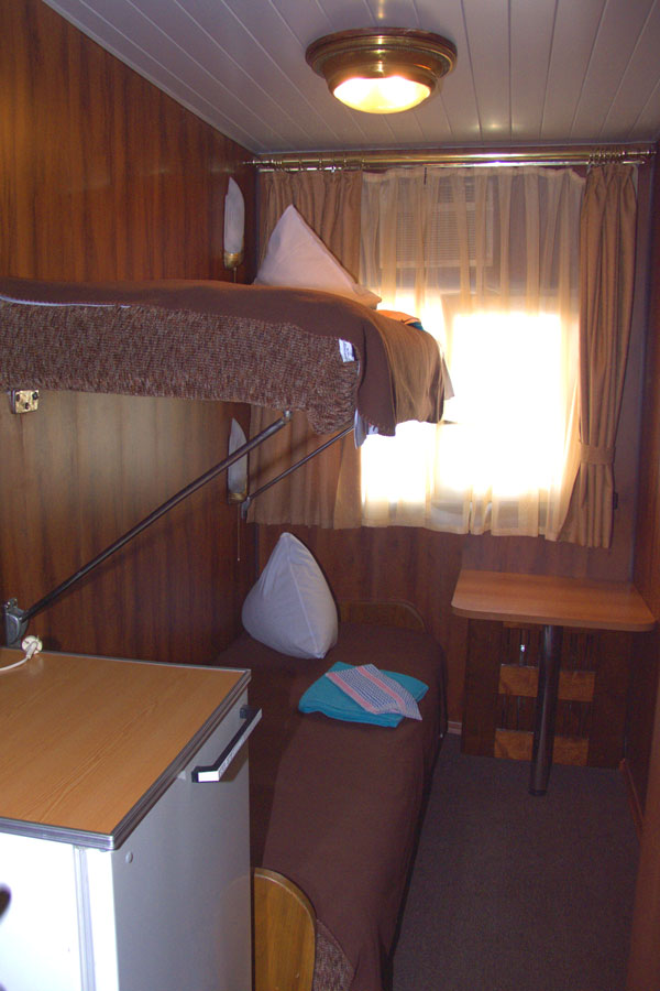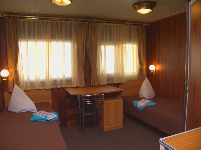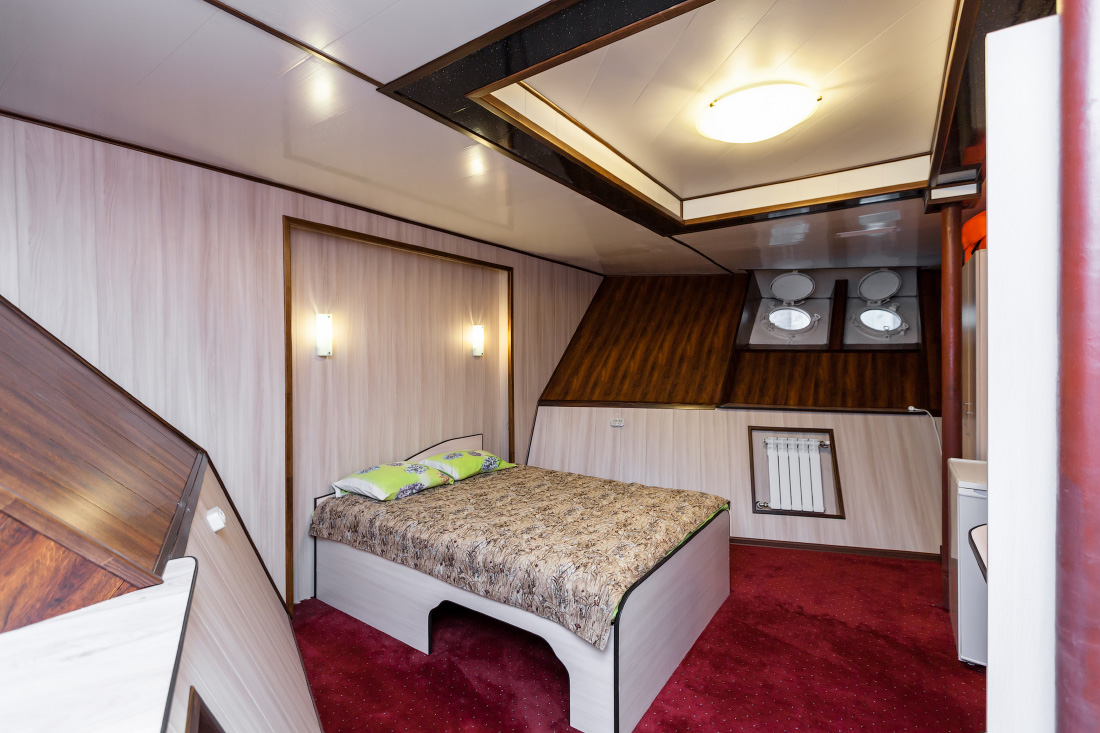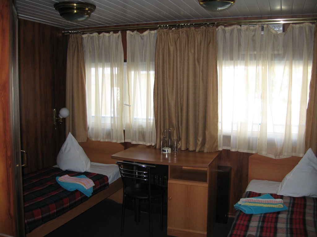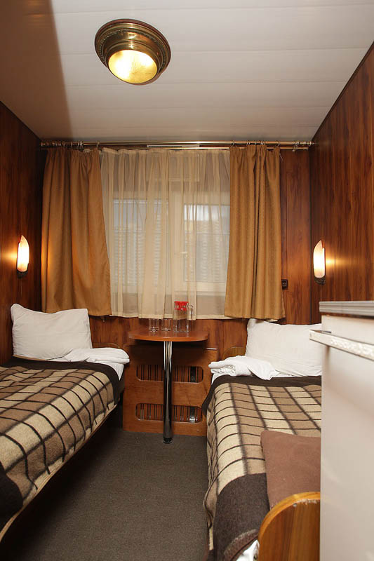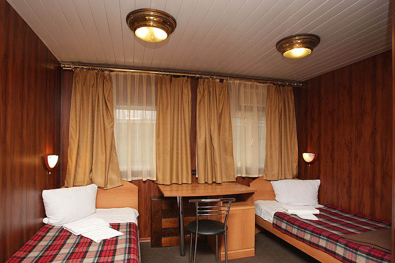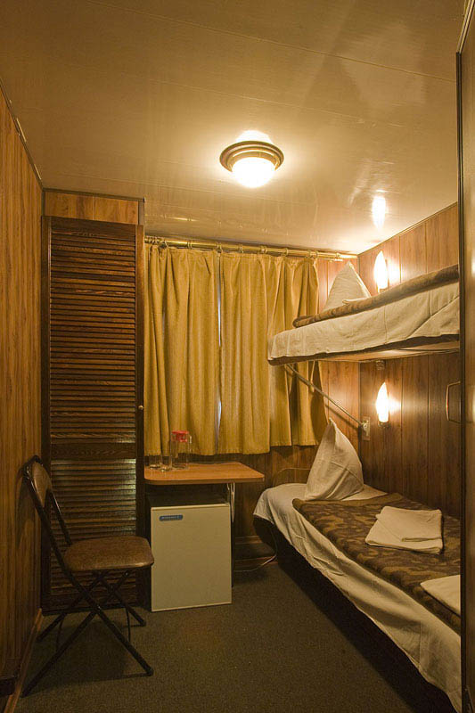 Двухместная двухъярусная каюта на нижней палубе. В каюте: туалет, душ, холодильник, фен, кондиционер, верхняя и нижняя полки, иллюминаторы. Каюты №: 80, 81.