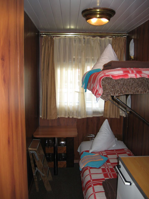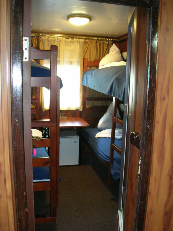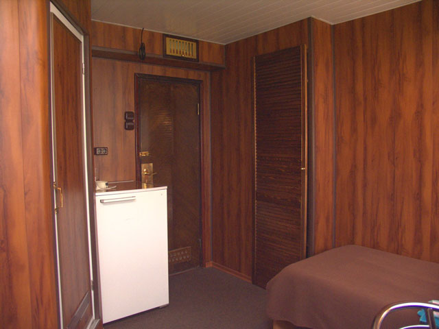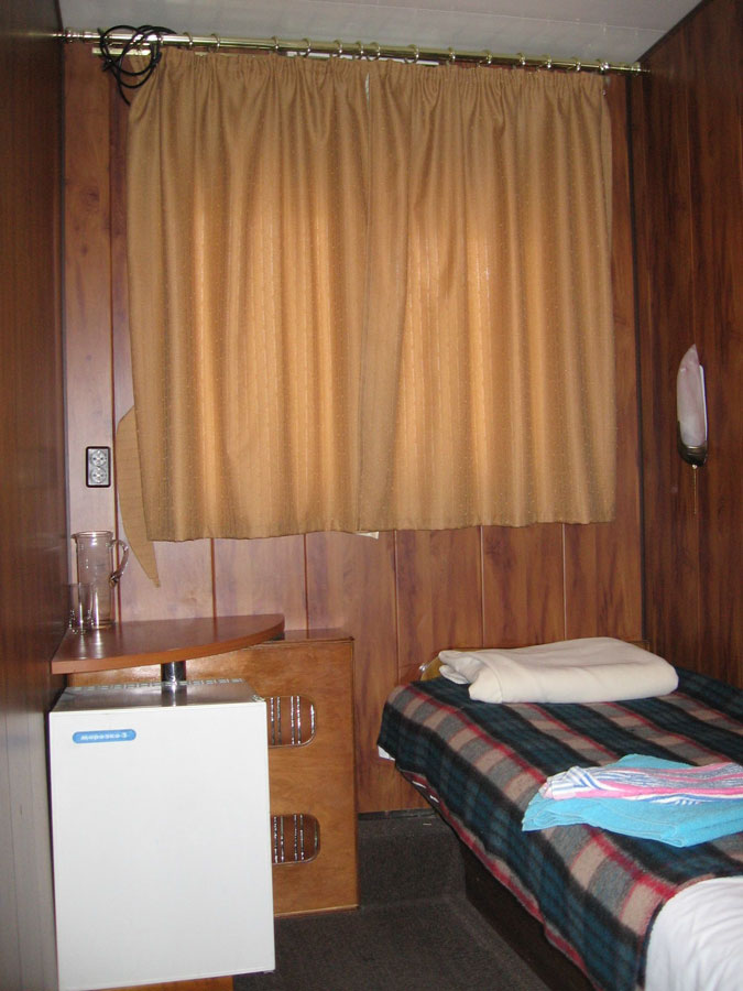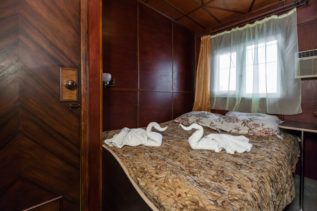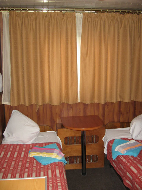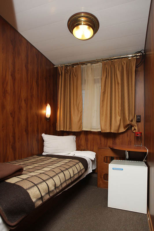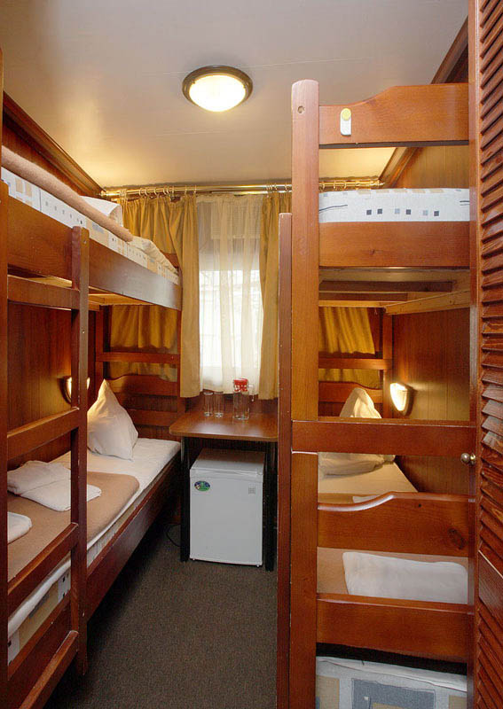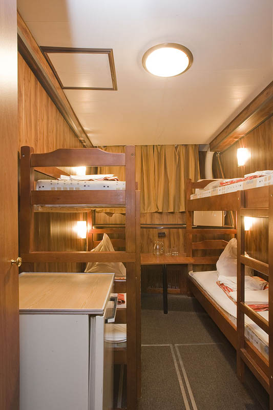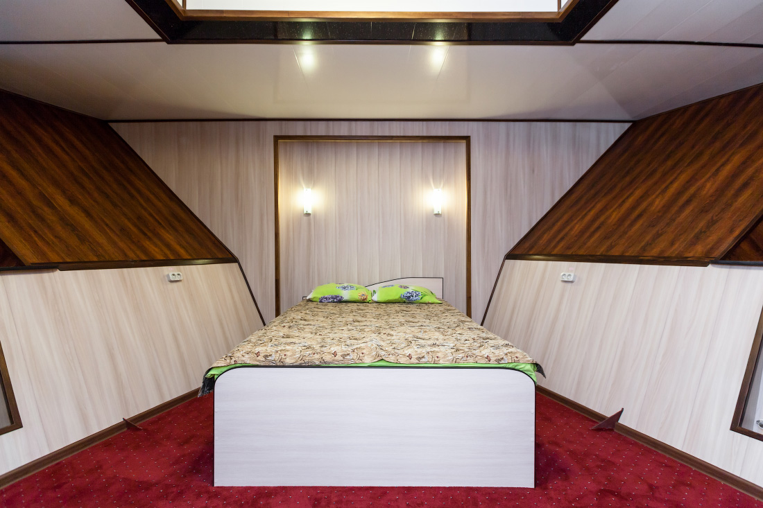 Двухместная двухъярусная каюта на нижней палубе. В каюте: туалет, душ, холодильник, фен, кондиционер, верхняя и нижняя полки, иллюминаторы. Каюты №: 80, 81.