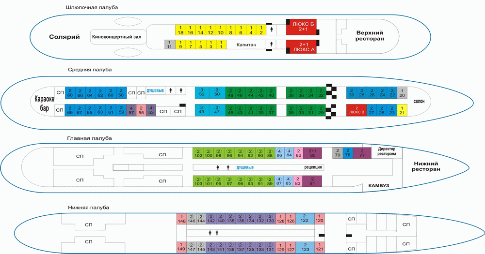 Двухместная одноярусная каюта с умывальником в кормовой части средней палубы. В каюте: два спальных места, умывальник с горячей и холодной водой, шкаф для одежды, радио, электророзетка, обзорное окно. Каюта № 55.