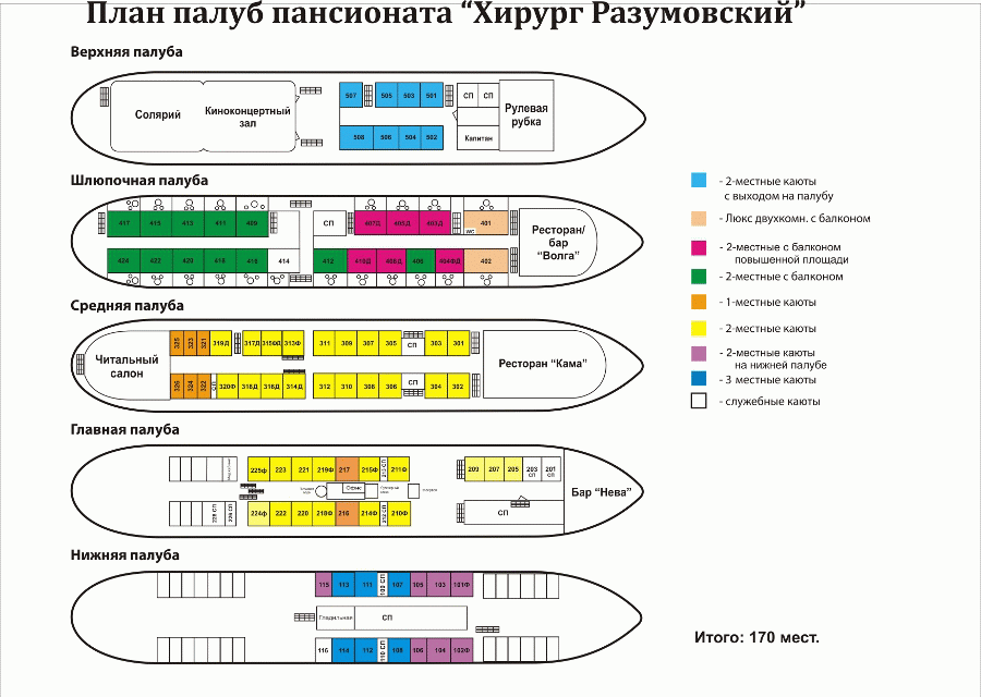 Теплоход "Хирург Разумовский" имеет каюты категории "Люкс", комфортабельные 1-но, 2-х и 3-местные каюты со всеми удобствами.