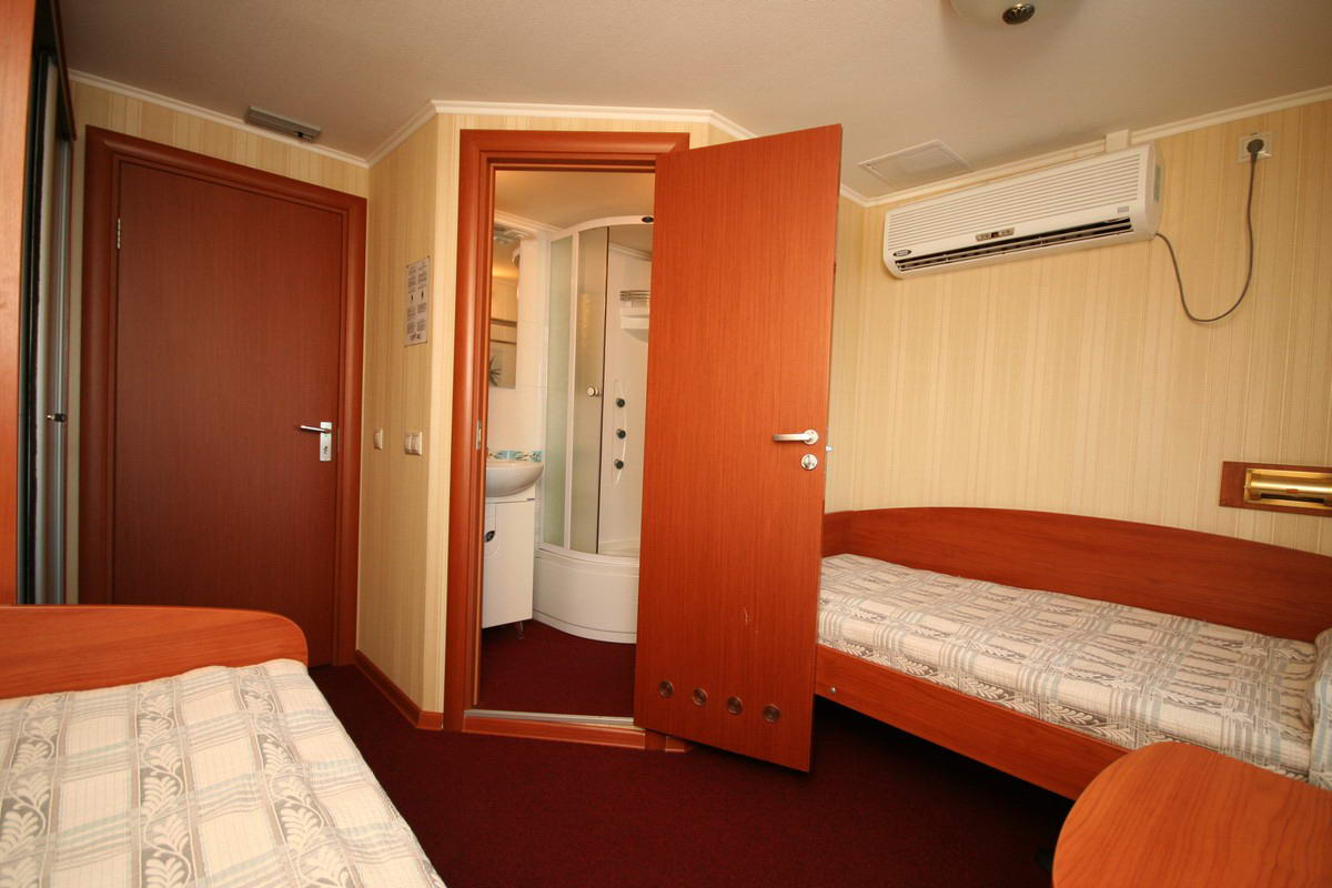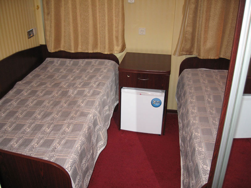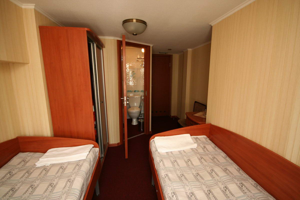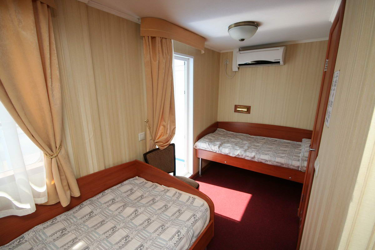 Двухместная одноярусная каюта со всеми удобствами. Расположение - на шлюпочной палубе (ограниченный вид). В каждой каюте - две кровати. Каюты имеют выход на балкон с палубной мебелью. Каюта № 414.