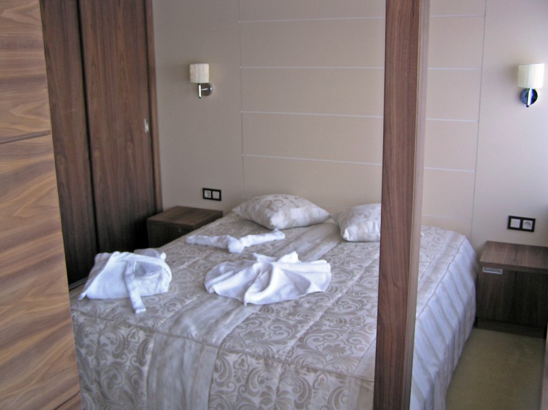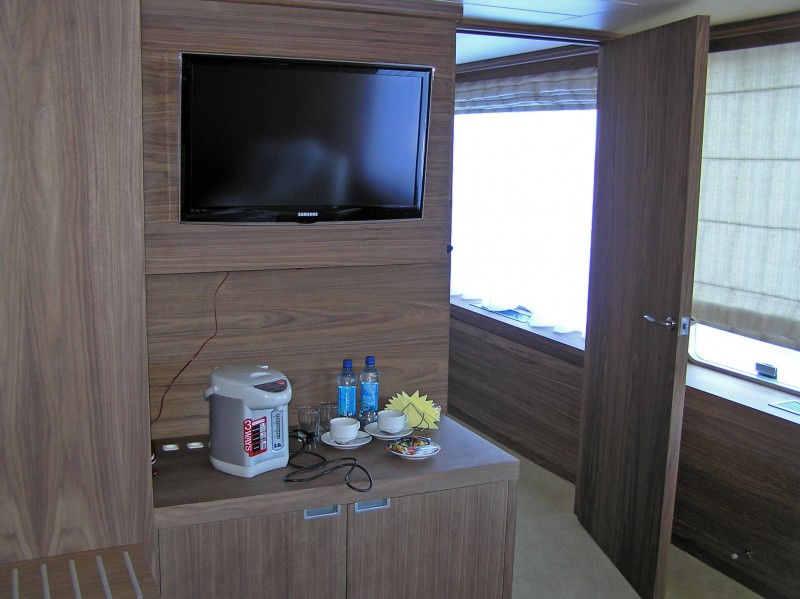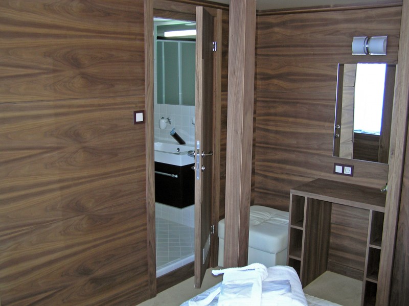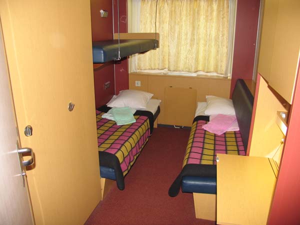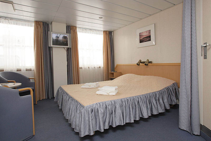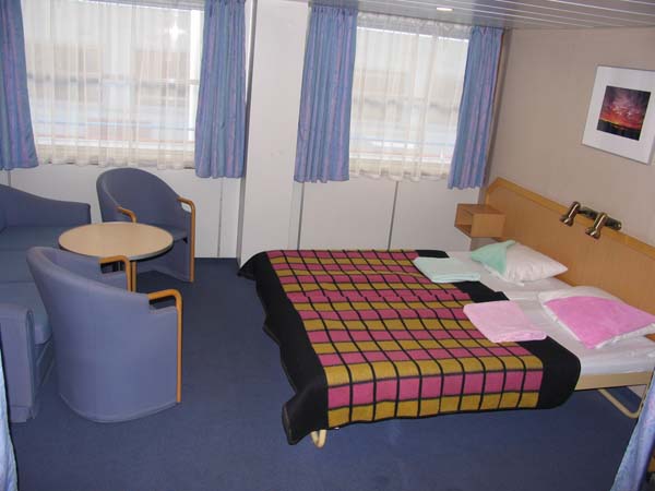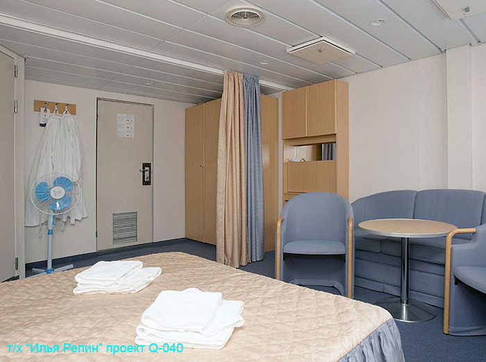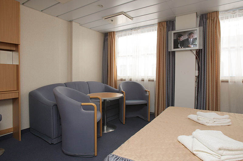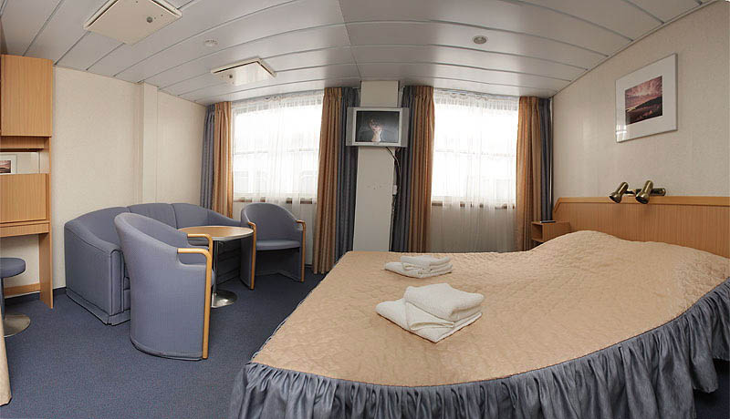 Двухместная двухкомнатная каюта, расположенная на шлюпочной палубе, рассчитана на размещение от двух до четырех человек. В каюте: двуспальная кровать (190х160), раздвижной диван с возможностью раскладки 220х140, душ, туалет, кондиционер, холодильник, шкаф, телевизор, фен, электрическая розетка 220 В, внутренняя телефонная связь, балкон. Каюта № 328.