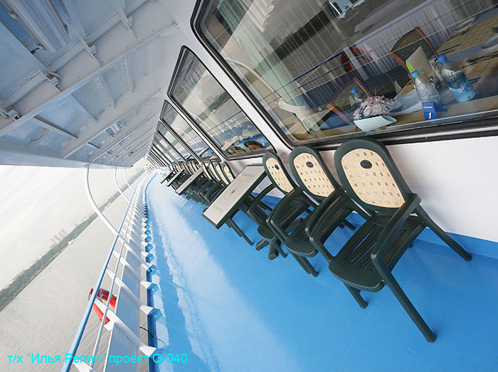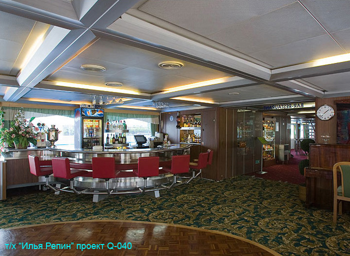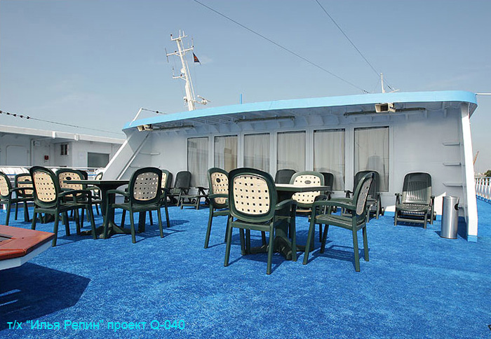 Четырехпалубный комфортабельный теплоход "Илья Репин" проекта Q-040. Построен в Австрии. Прошел модернизацию. Длина 110 м, ширина 14,5 м, скорость 22 км/ч, осадка 2,2м. Максимальная пассажировместимость теплохода 186 человек. Численность экипажа и обслуживающего персонала 78 человек.