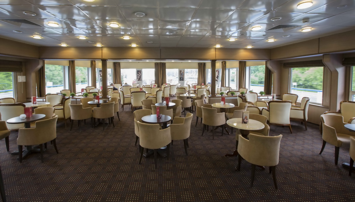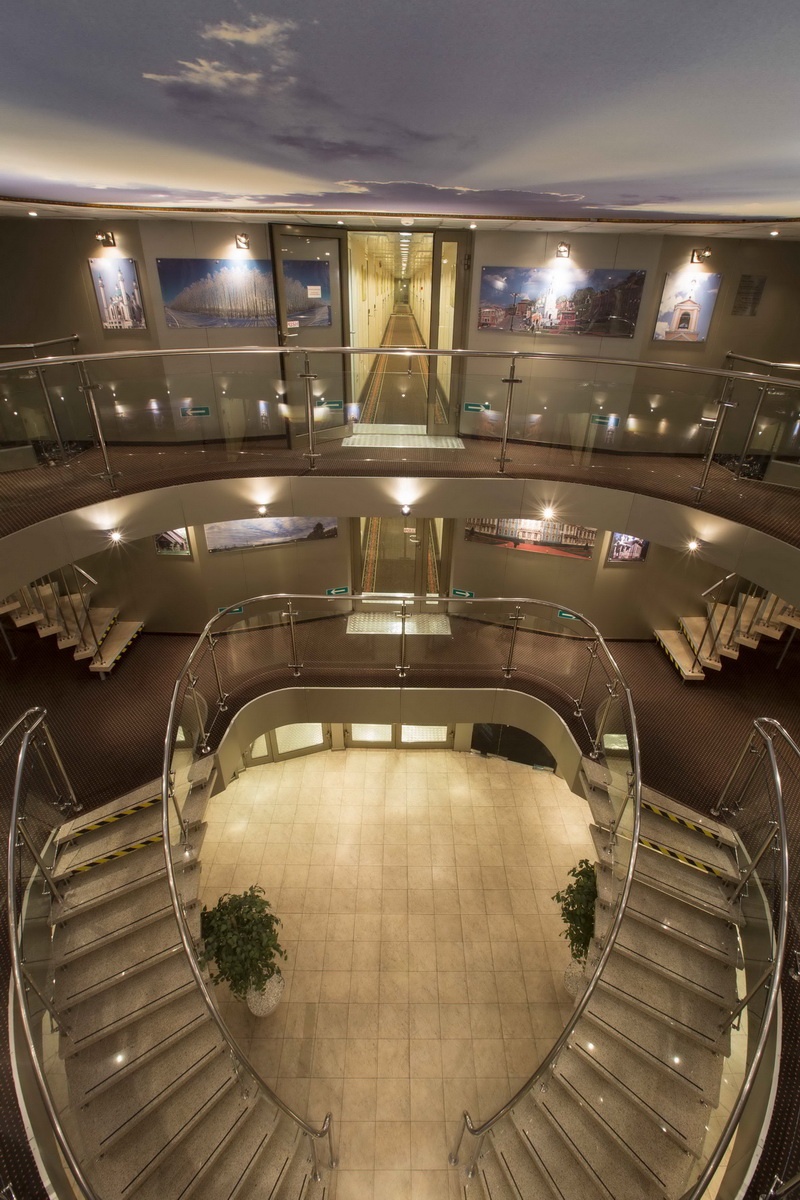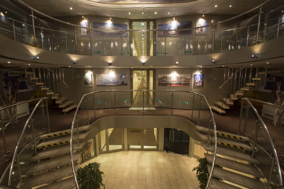 Во всех каютах: шкаф для одежды, телевизор (спутниковое телевидение), сейф, холодильник, фен, радио, телефон, душ, санузел, обзорное окно или балкон, электророзетка 220V.