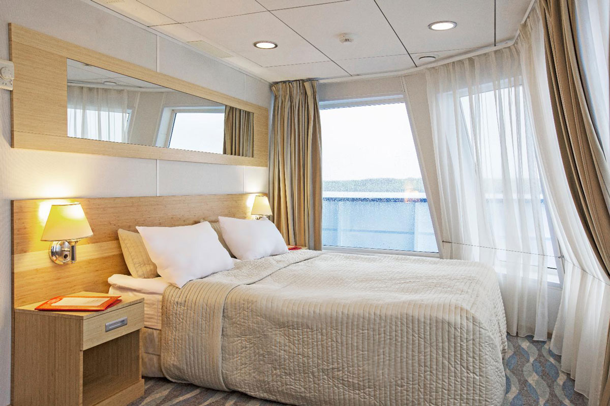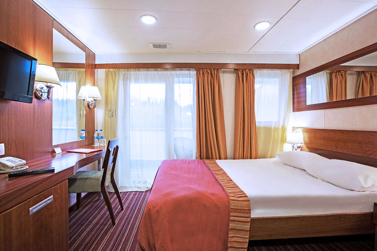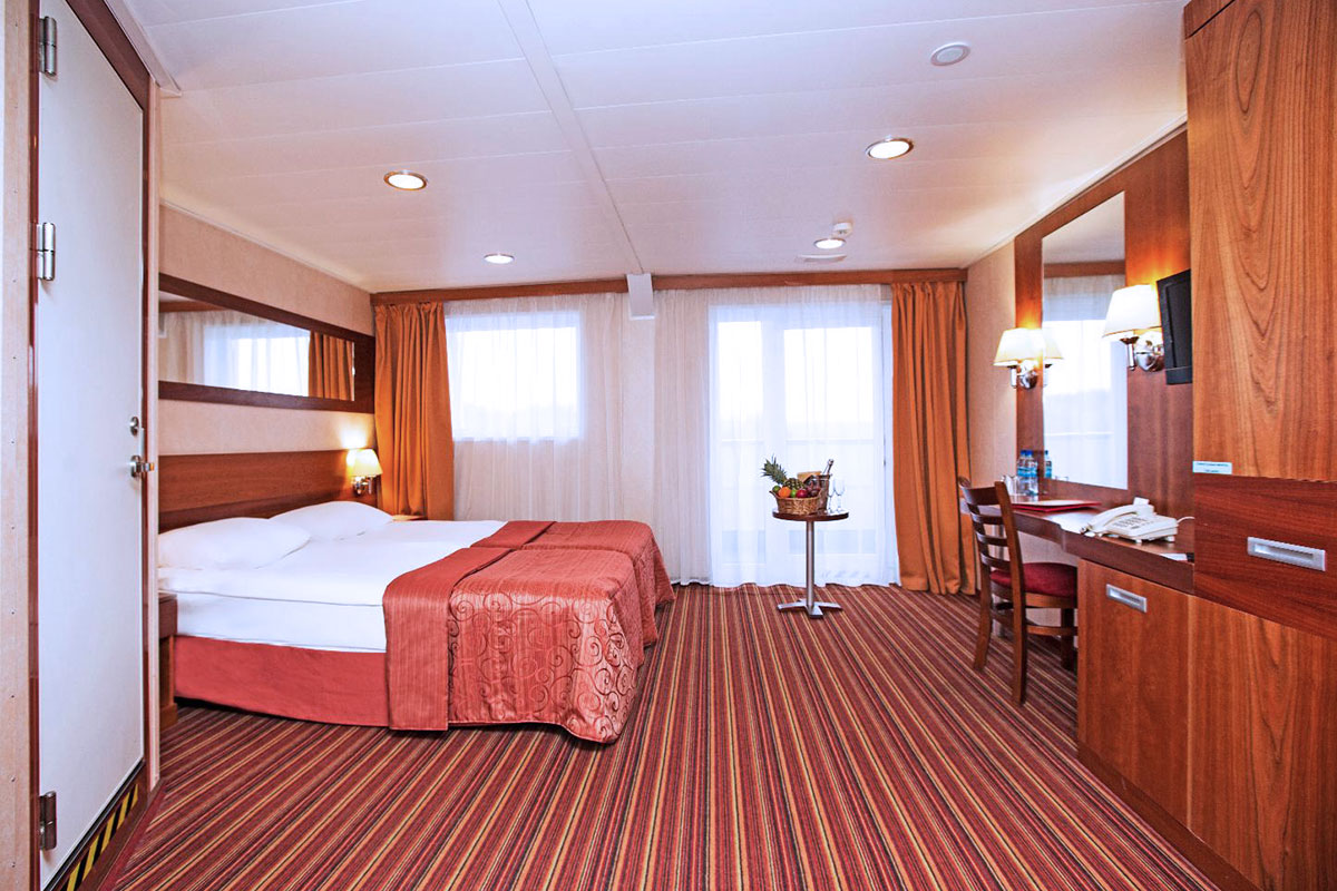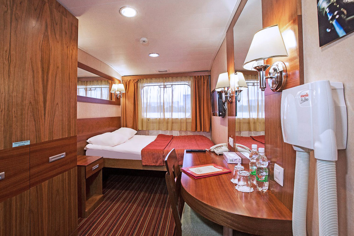Однокомнатная каюта с удобствами, рассчитанная на размещение до двух человек, расположенная на средней палубе. В каюте: две односпальные кровати или двуспальная кровать, прикроватные тумбы, трюмо, стул, шкаф, телевизор, холодильник, радио, телефон, обзорное окно, душ, санузел, кондиционер, фен, сейф, электророзетка на 220V. В каютах 103-109 — две односпальные кровати (размер 80х200 см, не сдвигаются); в каютах 111, 112, 122, 123 — двуспальная кровать (размер 140х200 см, подход к спальному месту только с одной стороны). Площадь каюты от 10 до 13 кв.м. Каюты №: 103-109, 111, 112, 122, 123.