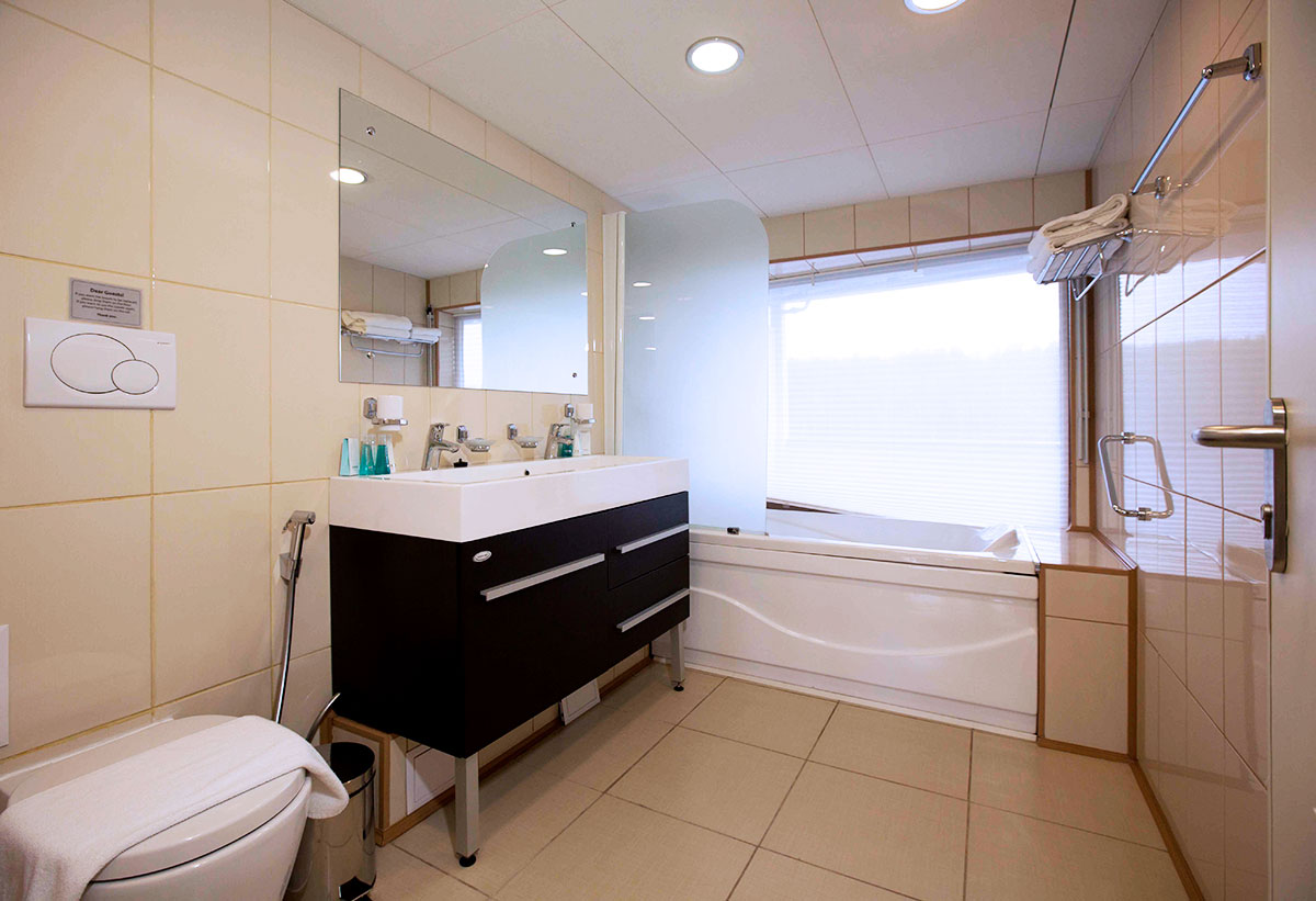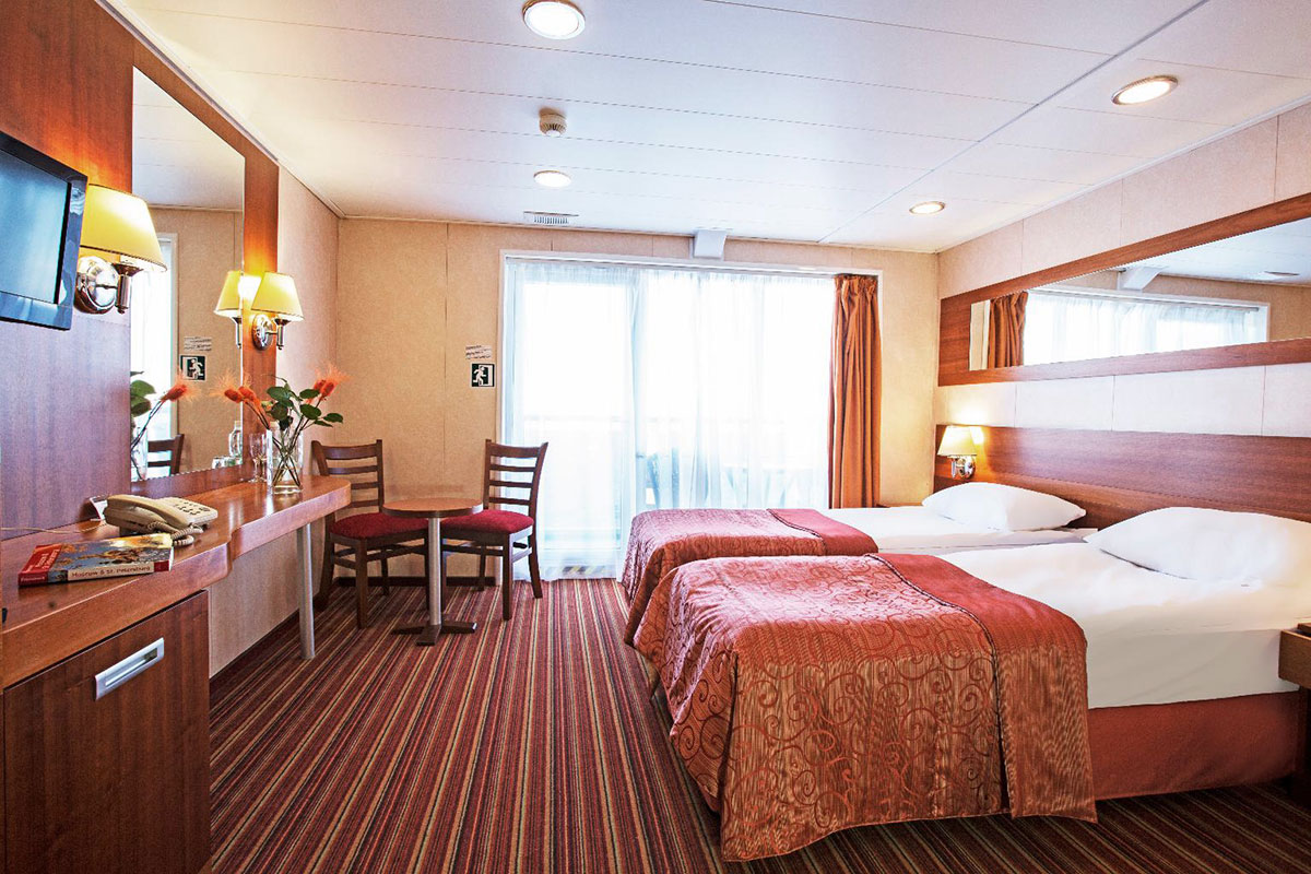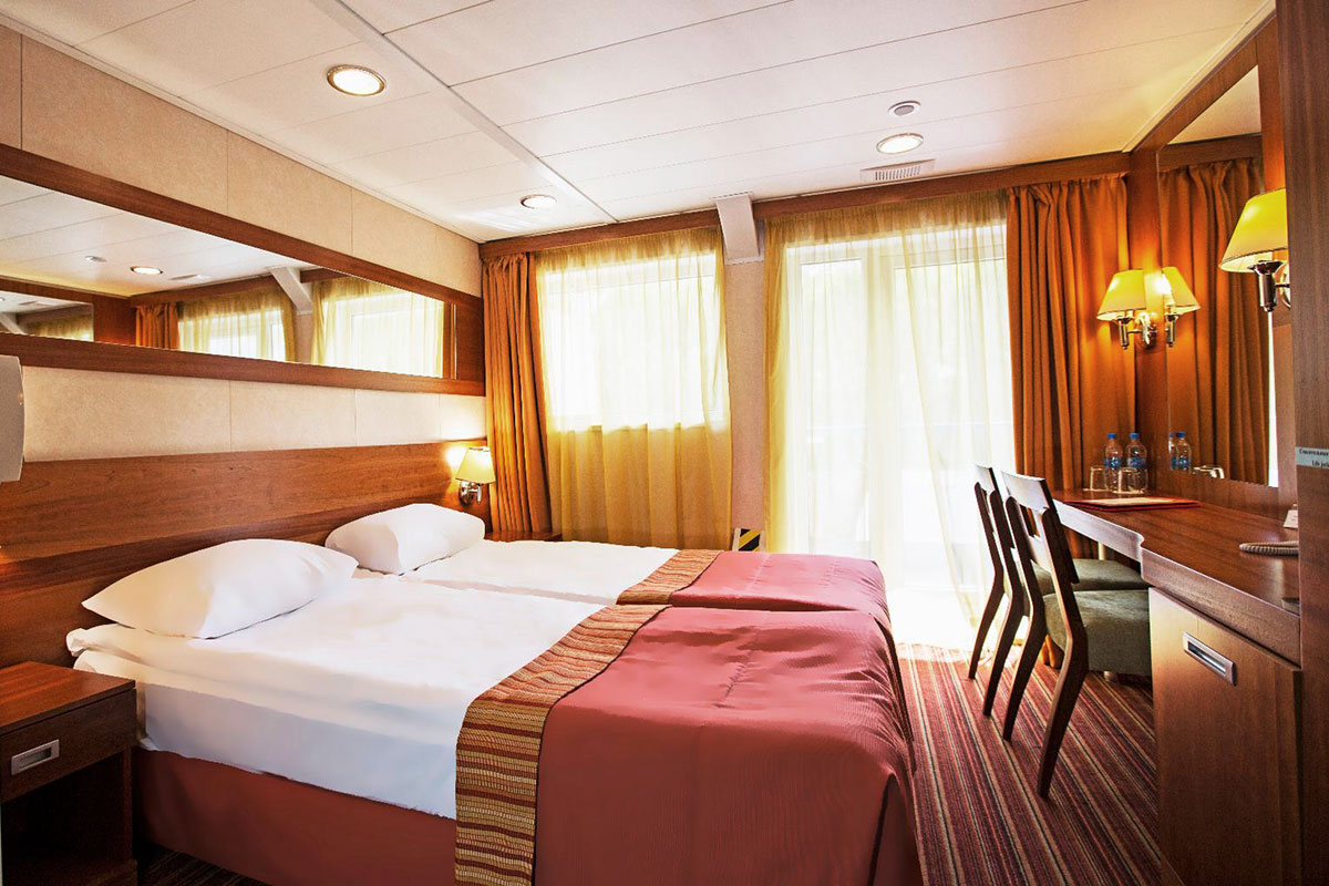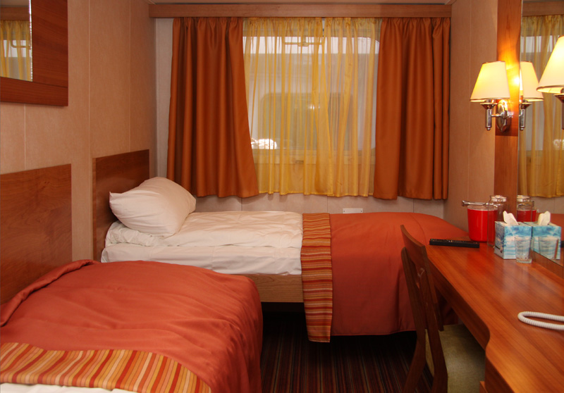 Однокомнатная каюта с удобствами, рассчитанная на размещение от двух до трех человек, расположенная на средней палубе. В каюте: две односпальные кровати (размер 80х200 см, можно сдвинуть), прикроватные тумбы, трюмо, стул, шкаф, телевизор, холодильник, радио, телефон, обзорное окно, душ, санузел, кондиционер, фен, сейф, электророзетка на 220V. Возможно размещение третьего человека на дополнительном месте (раскладушка). Площадь каюты от 18,7 до 22,6 кв.м. Каюты №: 201, 220, 221.