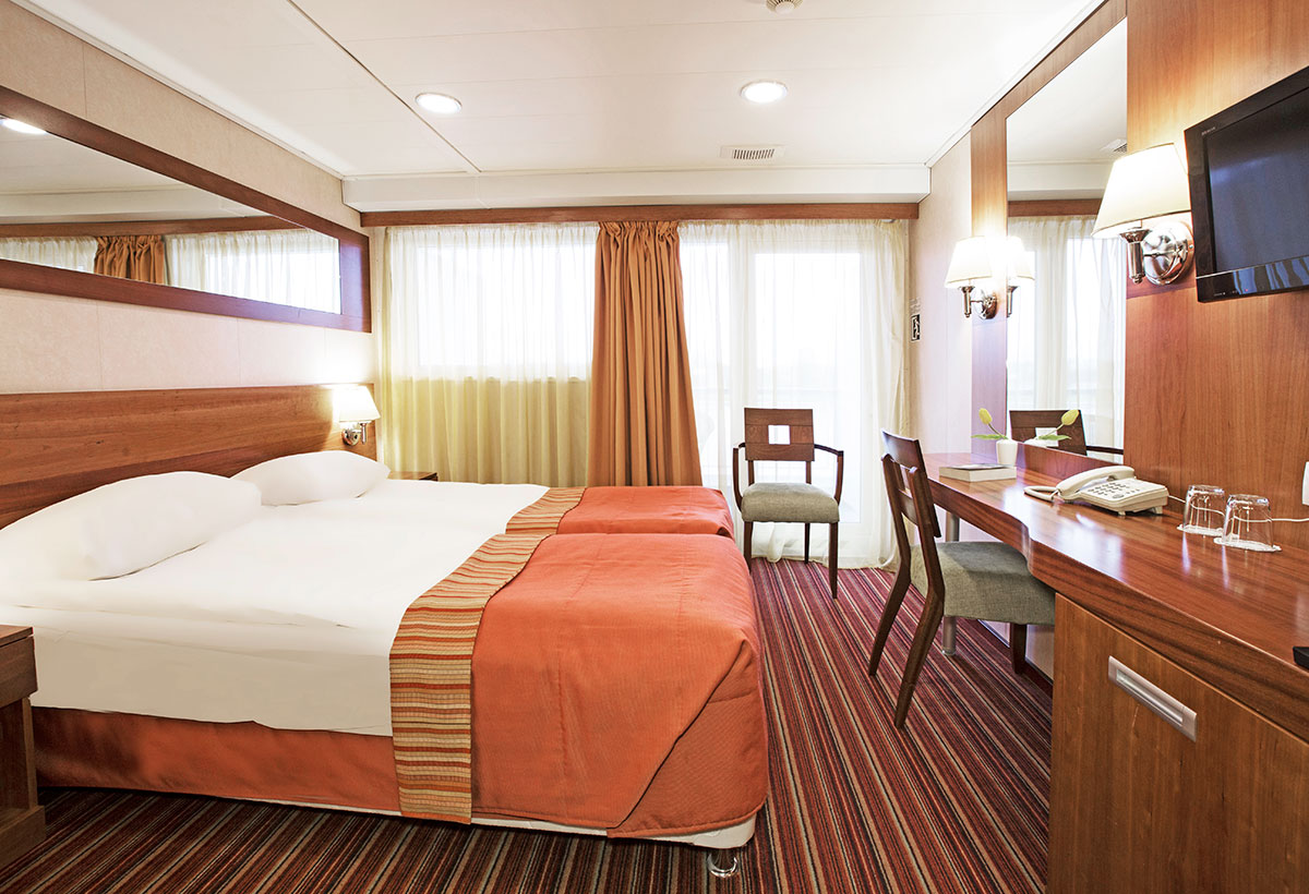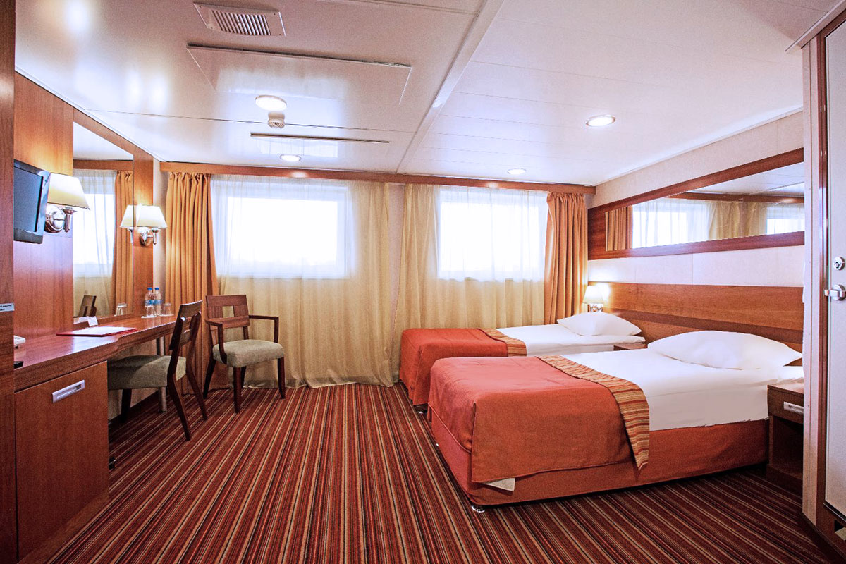 Однокомнатная каюта с удобствами, рассчитанная на размещение двух человек, расположенная на главной палубе. В каюте: две односпальные кровати (размер 80х200 см, можно сдвинуть), прикроватные тумбы, трюмо, стул, шкаф, телевизор, холодильник, радио, телефон, обзорное окно, душ, санузел, кондиционер, фен, сейф, электророзетка на 220V. Площадь каюты от 18,7 до 22,6 кв.м. Каюты №: 100-102, 110, 115-120, 121.