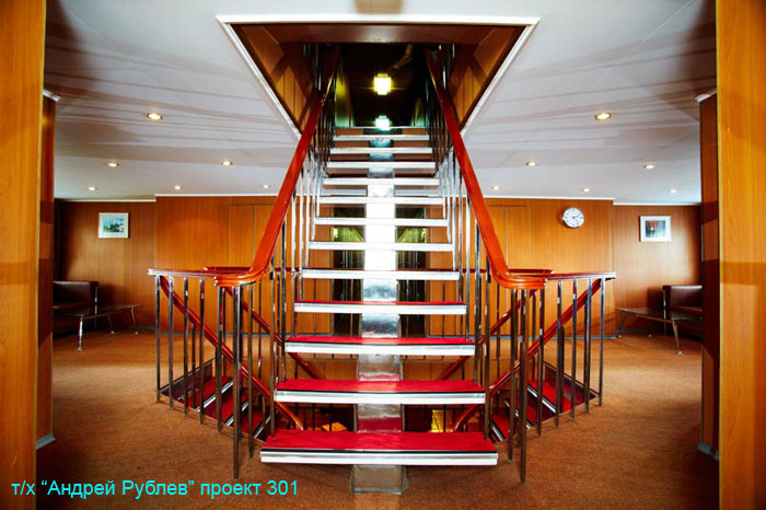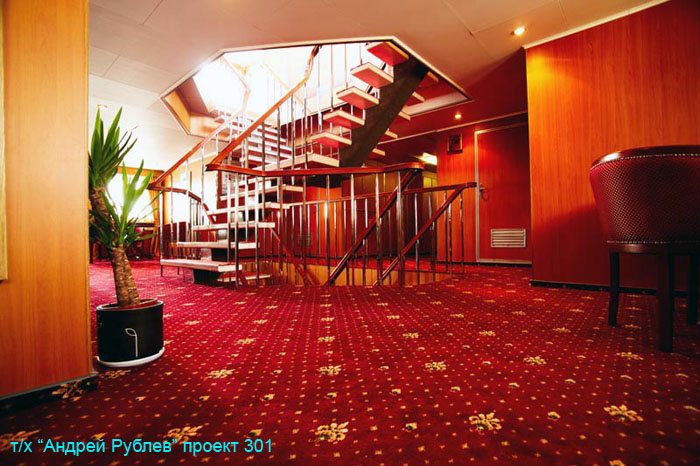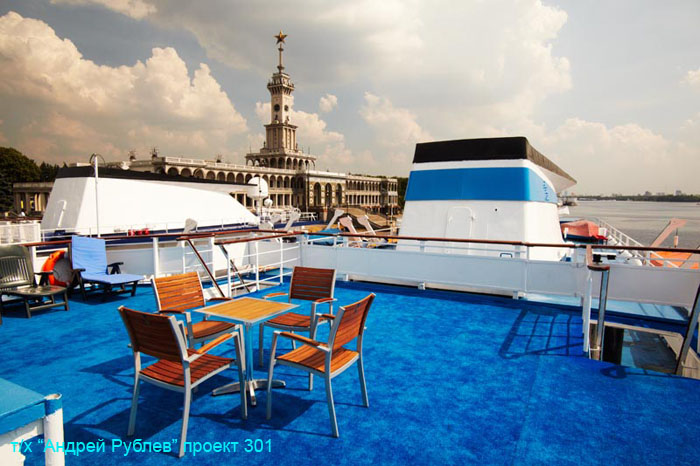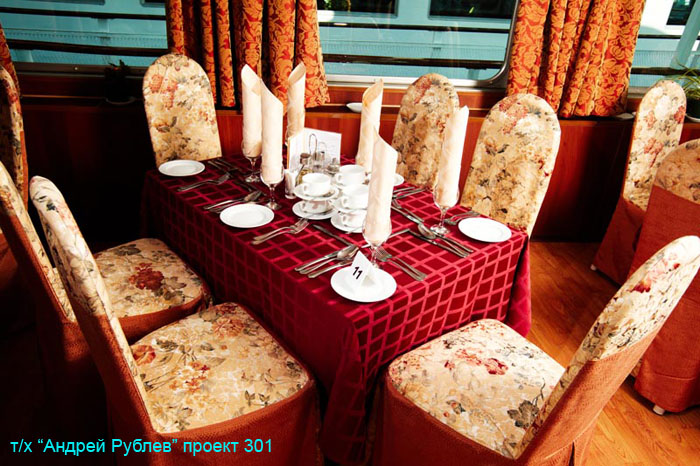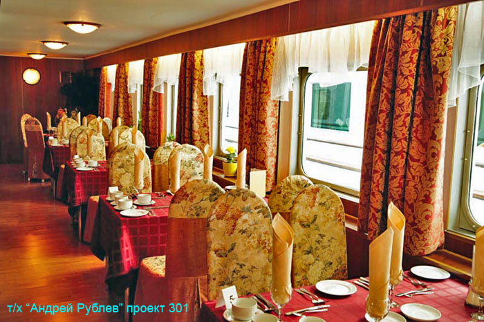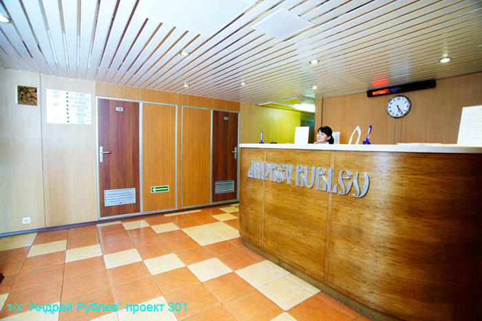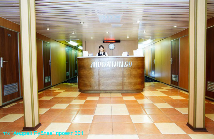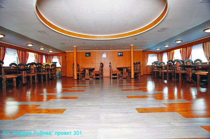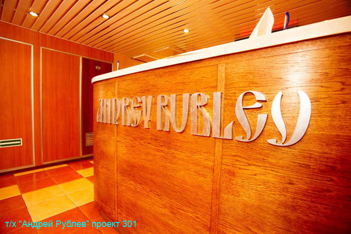 Четырехпалубный комфортабельный теплоход "Андрей Рублев" (проект 301). Построен на судоверфях в Германии. Прошел модернизацию. Оснащен современной навигационной техникой. Максимальная пассажировместимость теплохода 296 человек. Численность экипажа и обслуживающего персонала 109 человек.