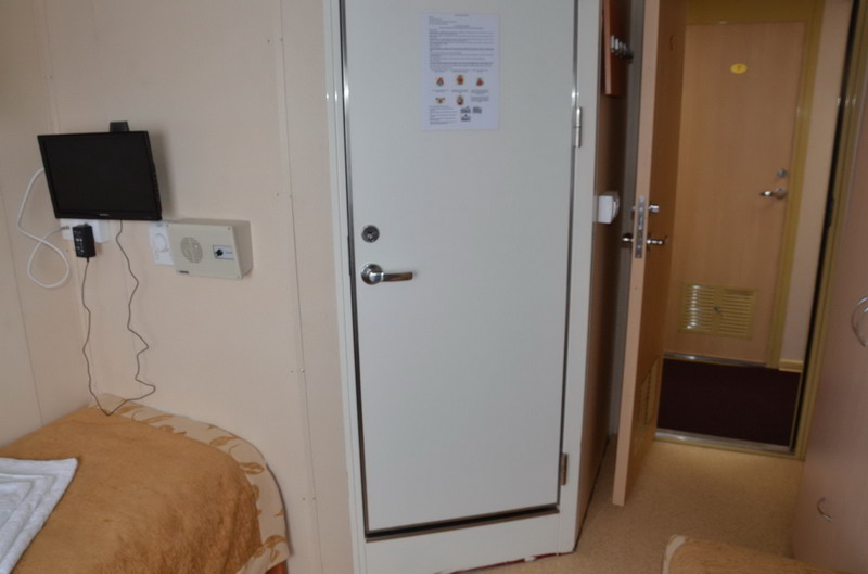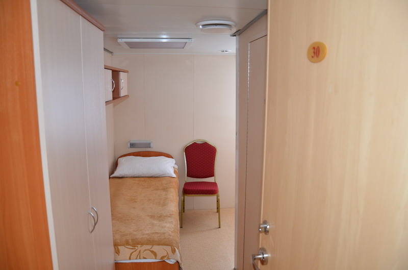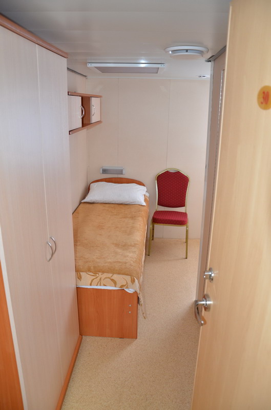 Одноместная каюта на шлюпочной палубе. кровать, санузел с душем, центральное кондиционирование "Фанкойл", тумба прикроватная, шкаф, телевизор, телефон, окно (не открывается), сейф, холодильник, плед. Каюта площадью 8 кв.м. Каюта № 30.