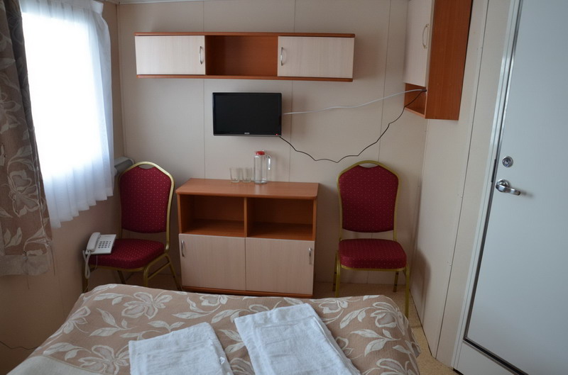 Двухместная одноярусная каюта на средней палубе. В каюте: двуспальная кровать, санузел с душем, центральное кондиционирование "Фанкойл", тумба прикроватная, шкаф, телевизор, телефон, окно (не открывается), сейф, холодильник. Каюта площадью 9 кв.м. Каюта № 53.