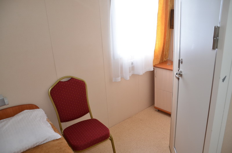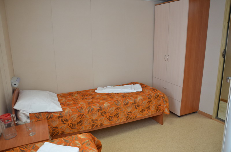 Одноместная каюта на средняя палубе. В каюте: кровать, санузел с душем, центральное кондиционирование "Фанкойл", тумба прикроватная, шкаф, телевизор, телефон, окно (не открывается), сейф, холодильник, плед. Каюта площадью 6 кв.м. Каюты №: 54-57.