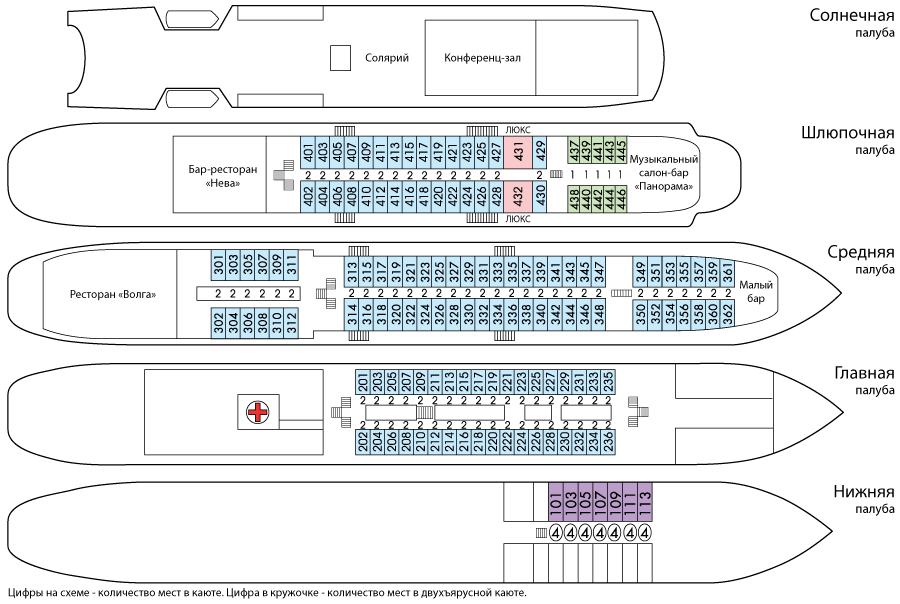Площадь кают: №№ 437-440 — 6,6 кв.м., 441-446 — 7,9 кв.м.