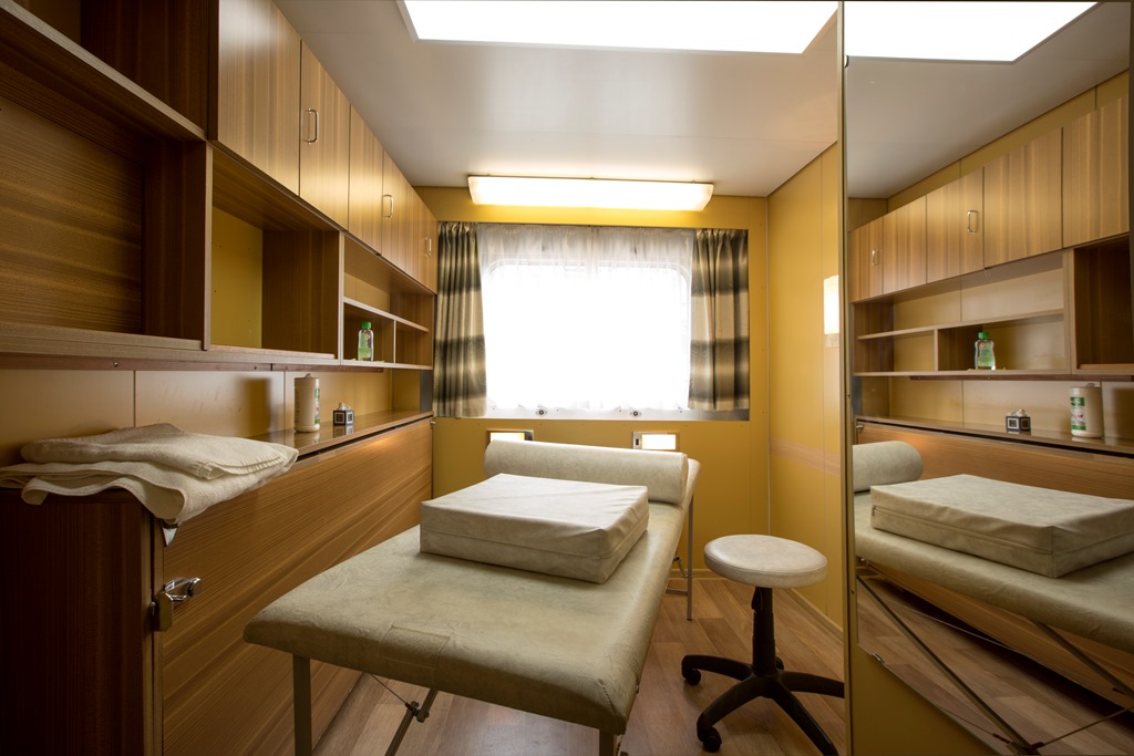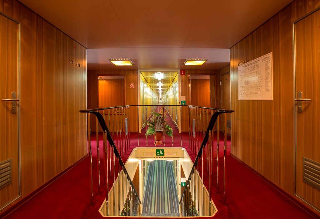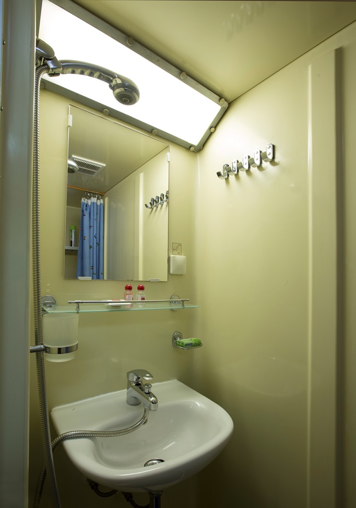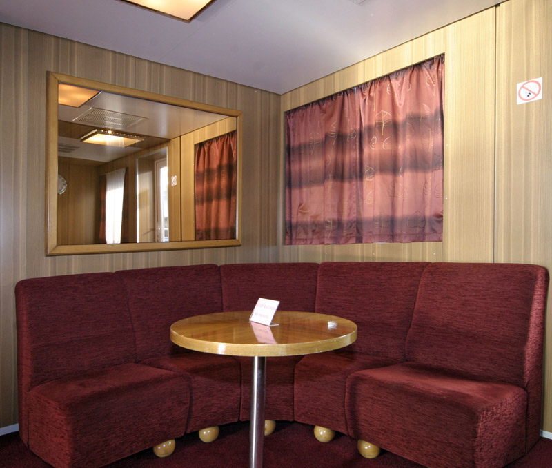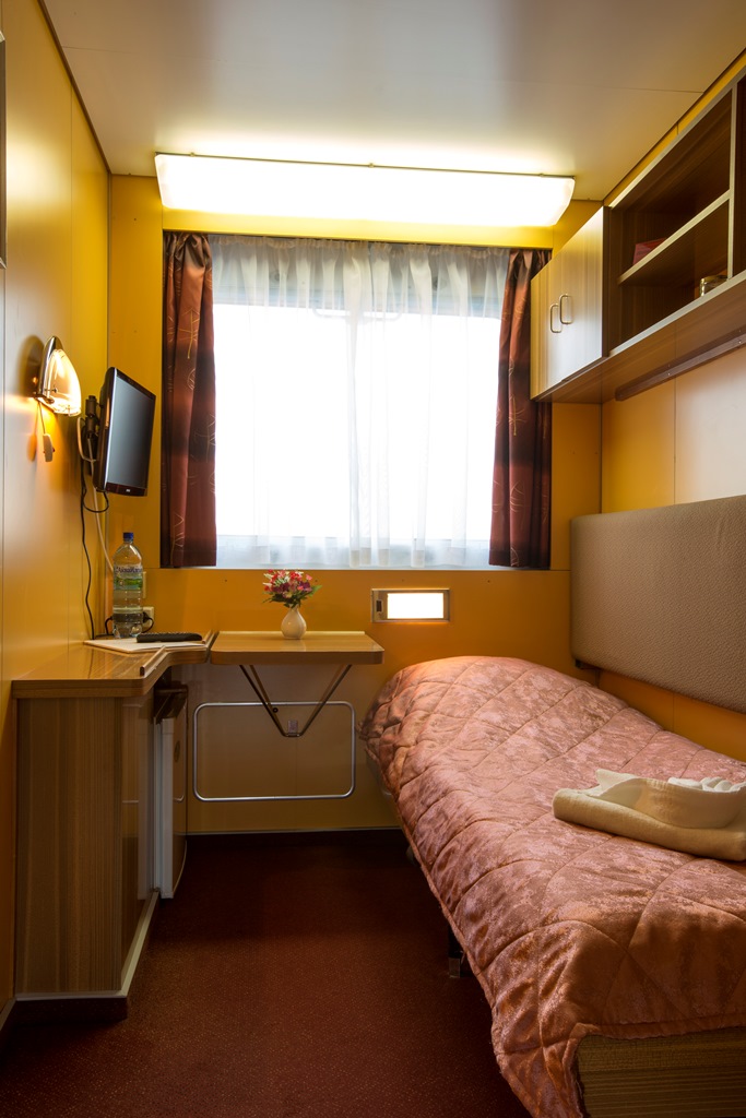 В каюте: одно спальное место (размер кровати 74х196 см), шкаф для одежды, холодильник, телевизор, фен, радио, душ, санузел, кондиционер, обзорное окно, электророзетка на 220V.