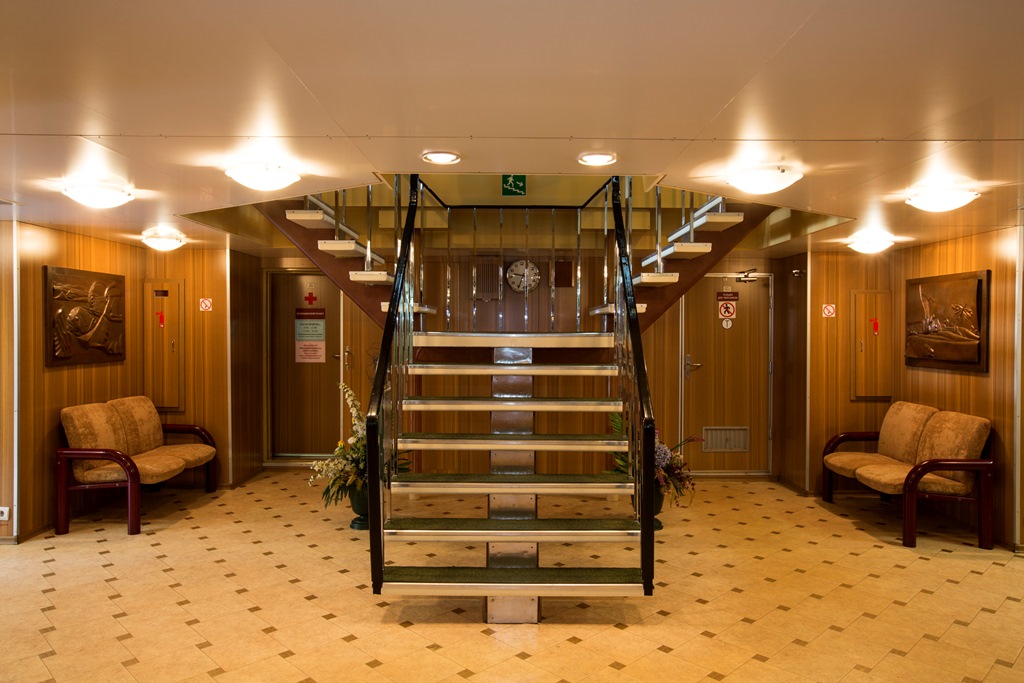 Во всех каютах: шкаф для одежды, радио, кондиционер, холодильник, фен, телевизор, душ, санузел, обзорное окно (или иллюминатор), электророзетка 220 V.