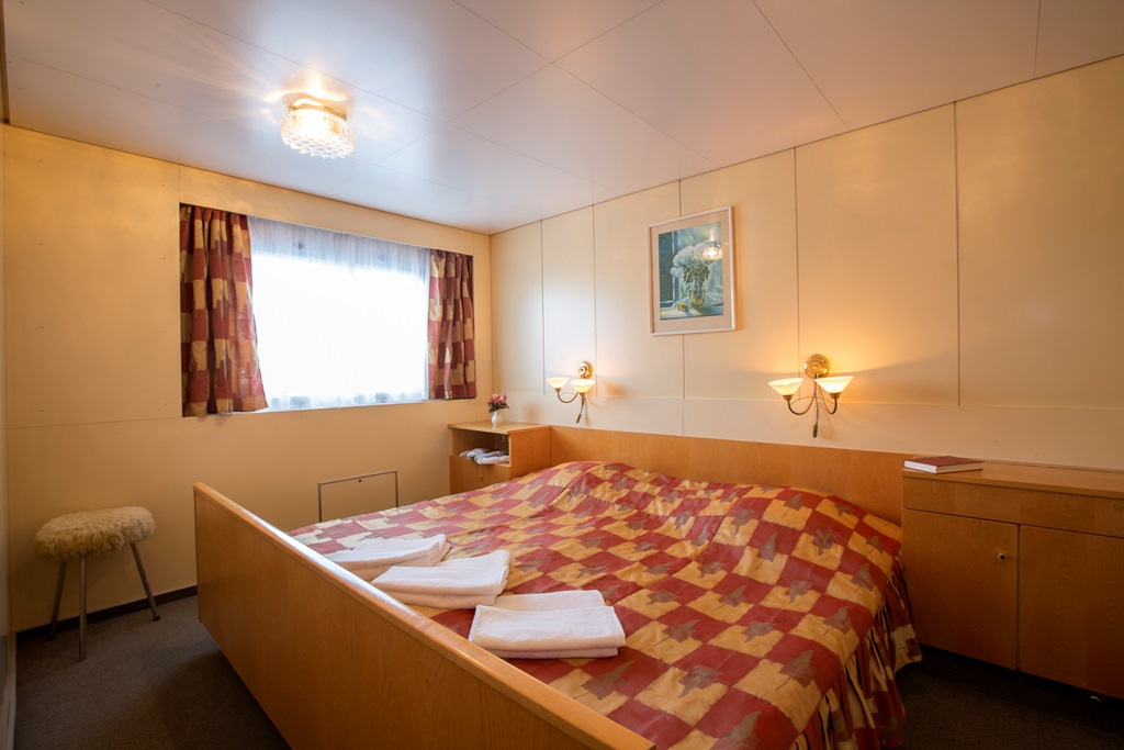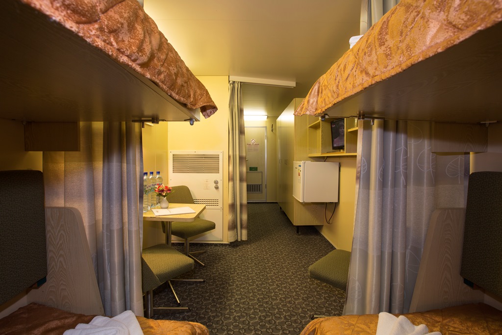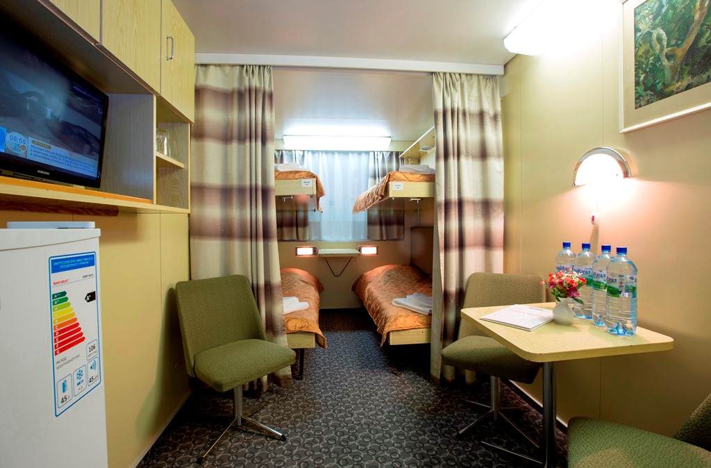 В каюте: четыре спальных места (два внизу, два вторым ярусом, размер кроватей 74х196 см), шкаф для одежды, холодильник, телевизор, фен, радио, душ, санузел, кондиционер, два иллюминатора, электророзетка на 220V.