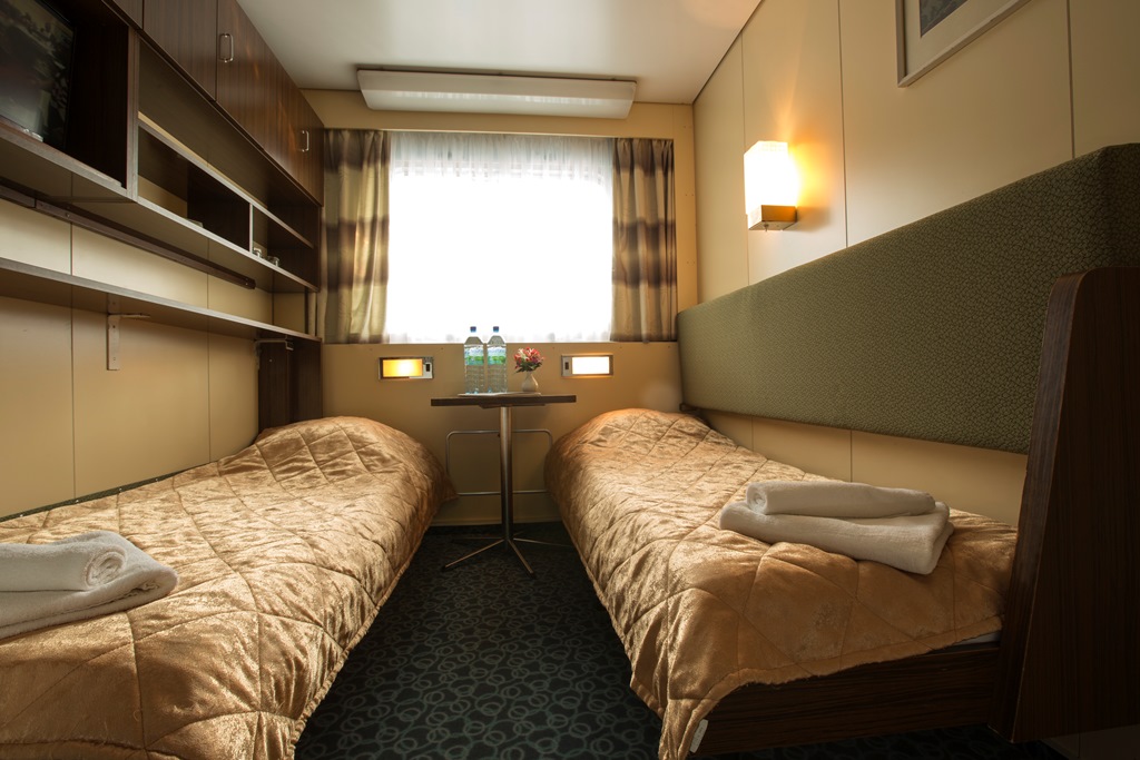 В каюте: два спальных места (размер кроватей 74х196 см), шкаф для одежды, холодильник, телевизор, фен, радио, душ, санузел, кондиционер, обзорное окно, электророзетка на 220V.