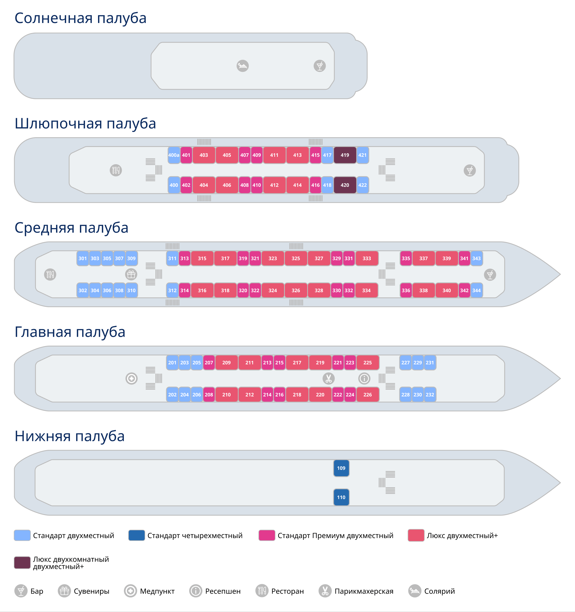 Есть возможность размещения третьего пассажира на дополнительном месте (диван). Приблизительная площадь каюты – 26 кв.м. Каюты №: 419, 420.