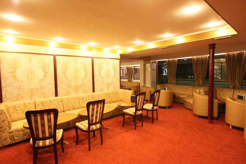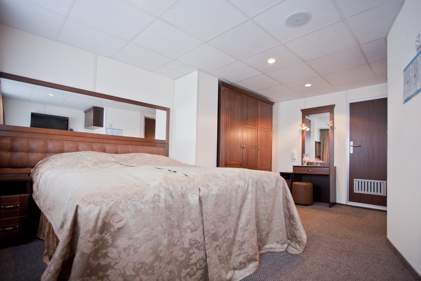 Каюта Люкс, расположенная на главной палубе, рассчитана на размещение от двух до трех пассажиров. Просторная каюта, оснащенная всем необходимым для комфортного отдыха. Каюта оборудована двуспальной кроватью (160х200 см), которую при желании можно раздвинуть, и диваном. Оснащение каюты: кондиционер/обогреватель, телевизор, сейф, внутренний телефон, фен, холодильник, набор посуды (тарелки, вилки, ножи, стаканы для воды), щетка для одежды, тапочки. Каюта оборудована двумя большими обзорными открывающимися окнами. Оснащение ванной комнаты в каюте: душ, зеркало, 2 стакана, туалетные принадлежности (мыло, шампунь, гель для душа, туалетная бумага), комплект полотенец (полотенце банное большое, полотенце для рук среднее, полотенце для ног). Сервис в каюте • Доступ к Wifi с ограничением трафика. • Бутилированная вода в каюту (0,5 л./чел.), единоразово, в день заезда. • Питьевая вода в свободном доступе (кулер). • Один бесплатный кофе в баре в день на пассажира на основное место (может быть заменен на чай). • Уборка каюты – 1 раз в день, в утреннее время. • Смена постельного белья – 1 раз в 7 дней (в рамках круиза длиннее 7 дней). • Смена полотенец – 1 раз в 3 дня. Есть возможность размещения третьего пассажира на дополнительном месте (диван). Приблизительная площадь каюты – 18,5 кв.м. Каюты №: 209-212, 217-220, 225, 226.