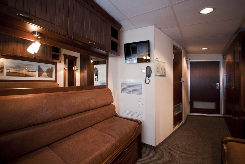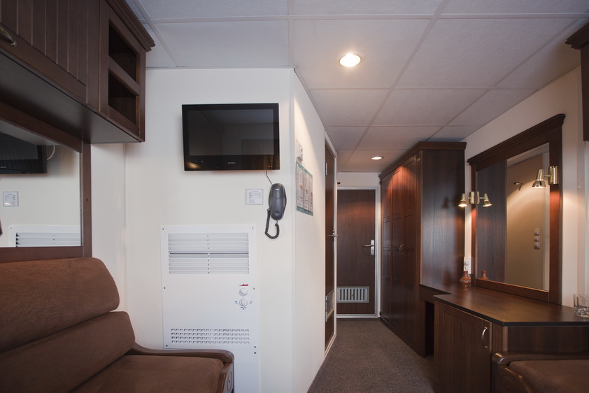 Каюта Люкс, расположенная на шлюпочной палубе, рассчитана на размещение от двух до трех пассажиров. Просторная каюта, оснащенная всем необходимым для комфортного отдыха. Каюта оборудована двуспальной кроватью (160х200 см), которую при желании можно раздвинуть, и диваном. Оснащение каюты: кондиционер/обогреватель, телевизор, сейф, внутренний телефон, фен, холодильник, набор посуды (тарелки, вилки, ножи, стаканы для воды), щетка для одежды, тапочки. Каюта оборудована двумя большими обзорными открывающимися окнами. Оснащение ванной комнаты в каюте: душ, зеркало, 2 стакана, туалетные принадлежности (мыло, шампунь, гель для душа, туалетная бумага), комплект полотенец (полотенце банное большое, полотенце для рук среднее, полотенце для ног). Сервис в каюте • Доступ к Wifi с ограничением трафика. • Бутилированная вода в каюту (0,5 л./чел.), единоразово, в день заезда. • Питьевая вода в свободном доступе (кулер). • Один бесплатный кофе в баре в день на пассажира на основное место (может быть заменен на чай). • Уборка каюты – 1 раз в день, в утреннее время. • Смена постельного белья – 1 раз в 7 дней (в рамках круиза длиннее 7 дней). • Смена полотенец – 1 раз в 3 дня. Есть возможность размещения третьего пассажира на дополнительном месте (диван). Приблизительная площадь каюты – 18,5 кв.м. Каюты №: 403-406, 411-414.