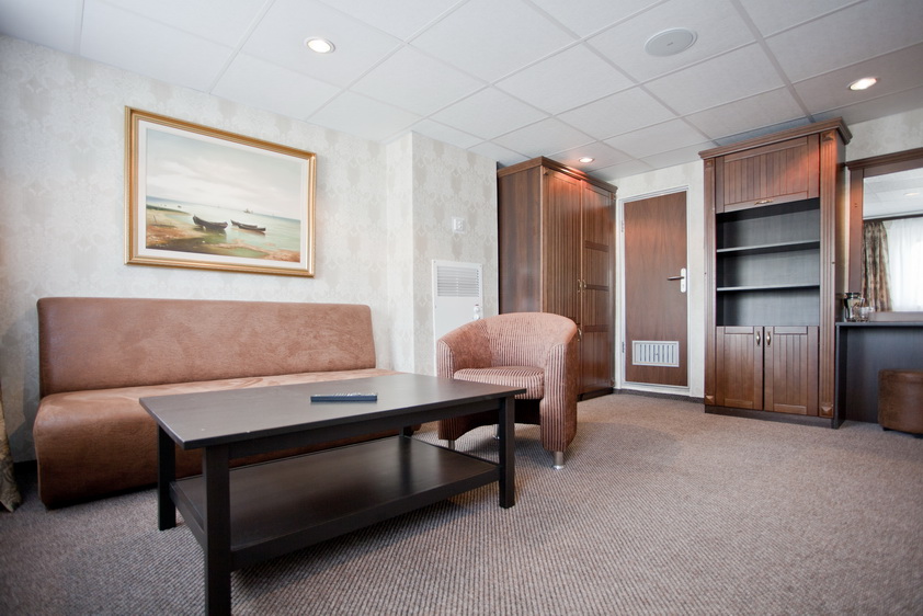 Двухкомнатная каюта Люкс, расположенная на шлюпочной палубе, рассчитана на размещение от двух до трех пассажиров. Просторная двухкомнатная каюта, оснащенная всем необходимым для комфортного отдыха. Каюта оборудована двуспальной кроватью (160х200 см, не раздвигается) и диваном. Оснащение каюты: кондиционер/обогреватель, телевизор, сейф, внутренний телефон, фен, холодильник, капсульная кофе-машина (по одной капсуле кофе ежедневно на основное место), набор посуды (тарелки, вилки, ножи, стаканы для воды, чайная пара, бокалы для вина), салфетки в коробке, халат банный, щетка для одежды, тапочки, блокнот и ручка фирменные. Каюта оборудована большими обзорными открывающимися окнами. Оснащение ванной комнаты в каюте: ванна, зеркало, 2 стакана, туалетные принадлежности (мыло, шампунь, гель для душа, туалетная бумага), комплект полотенец (полотенце банное большое, полотенце для рук среднее, полотенце для ног). Сервис в каюте • Доступ к Wifi без ограничения трафика. • Бутилированная вода в каюту (0,5 л./чел.), единоразово, в день заезда. • Питьевая вода в свободном доступе (кулер). • Уборка каюты – 1 раз в день, в утреннее время. • Смена постельного белья – 1 раз в 7 дней (в рамках круиза длиннее 7 дней). • Смена полотенец – 1 раз в 3 дня. Есть возможность размещения третьего пассажира на дополнительном месте (диван). Приблизительная площадь каюты – 26 кв.м. Каюты №: 419, 420.