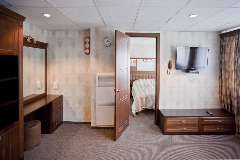 Каюта Люкс, расположенная на средней палубе, рассчитана на размещение от двух до трех пассажиров. Просторная каюта, оснащенная всем необходимым для комфортного отдыха. Каюта оборудована двуспальной кроватью (160х200 см), которую при желании можно раздвинуть, и диваном. Оснащение каюты: кондиционер/обогреватель, телевизор, сейф, внутренний телефон, фен, холодильник, набор посуды (тарелки, вилки, ножи, стаканы для воды), щетка для одежды, тапочки. Каюта оборудована двумя большими обзорными открывающимися окнами. Оснащение ванной комнаты в каюте: душ, зеркало, 2 стакана, туалетные принадлежности (мыло, шампунь, гель для душа, туалетная бумага), комплект полотенец (полотенце банное большое, полотенце для рук среднее, полотенце для ног). Сервис в каюте • Доступ к Wifi с ограничением трафика. • Бутилированная вода в каюту (0,5 л./чел.), единоразово, в день заезда. • Питьевая вода в свободном доступе (кулер). • Один бесплатный кофе в баре в день на пассажира на основное место (может быть заменен на чай). • Уборка каюты – 1 раз в день, в утреннее время. • Смена постельного белья – 1 раз в 7 дней (в рамках круиза длиннее 7 дней). • Смена полотенец – 1 раз в 3 дня. Есть возможность размещения третьего пассажира на дополнительном месте (диван). Приблизительная площадь каюты – 18,5 кв.м. Каюты №: 315-318, 323-328, 333, 334, 337-340.