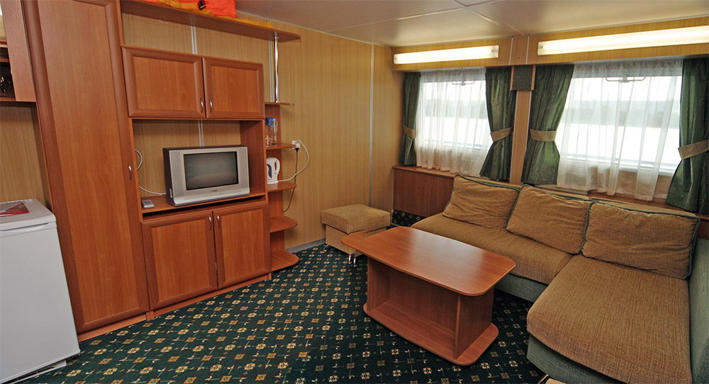 Двухкомнатная каюта с удобствами на средней палубе, рассчитанная на размещение от двух до четырех человек. В гостиной: мягкая мебель (мягкий пуф, диван, раскладывающийся на двух человек), шкаф-стенка, журнальный столик, телевизор, холодильник, радио, два обзорных окна, электророзетка на 220V. В спальне: двуспальная кровать, трюмо, шкаф для одежды, два обзорных окна. Размер кроватей 75х190 см. Площадь гостиной - 10,64 кв.м, площадь спальни - 10,64 кв.м. Дополнительные привилегии для гостей кают класса «Люкс»: • капсульная кофемашина – 1 капсула в день на человека (по количеству гостей в каюте), кофе порционный (если нет капсульной кофемашины в каюте); • игристое вино (1 бутылка на каюту) в день посадки, без пополнения только в рейсах от 6 дней; • чайный набор в рейсах любой продолжительности (ежедневное пополнение); • обслуживание в каюте (время предоставления услуги ограничено, подробные условия дополнительно уточняйте на теплоходе): заказ блюд и напитков по действующему прайс-листу из Бара, обслуживание бесплатно; заказ блюд и напитков по основному меню ресторана, обслуживание платно. Каюта № 139.