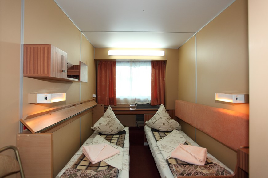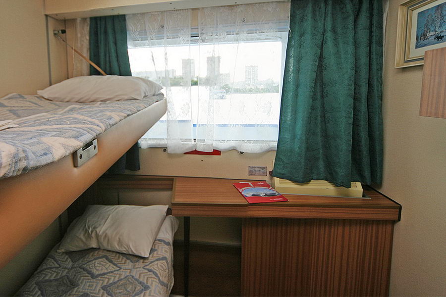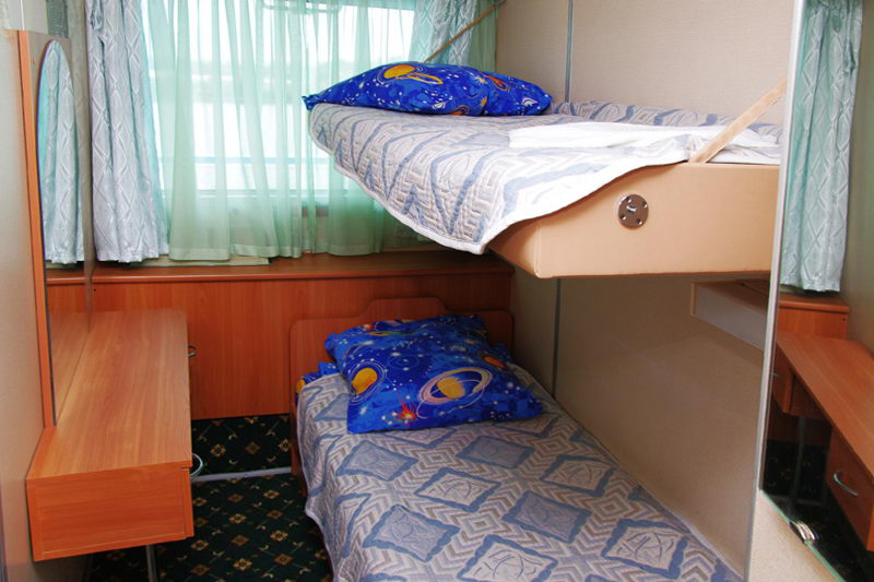 Двухместная двухъярусная каюта со всеми удобствами на средней палубе. В каюте: два спальных места (одно над другим), шкаф для одежды, радио, душ, санузел, кондиционер, обзорное окно электророзетка на 220V. Размер кроватей 75х190 см. Площадь каюты от 5,88 до 7,56 кв.м. Каюты №: 73-76. 81-88, 108-129, 131, 136, 138, 140-143.