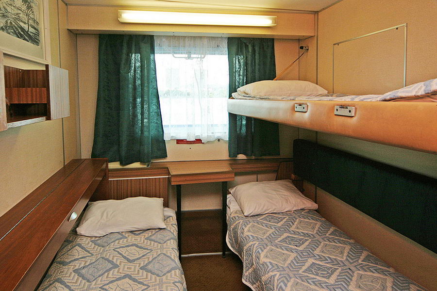 Трехместная двухъярусная каюта со всеми удобствами на средней палубе. В каюте: три спальных места (два внизу, одно вторым ярусом), шкаф для одежды, трюмо, радио, душ, санузел, кондиционер, обзорное окно, электророзетка на 220V. Размер кроватей 75х190 см. Площадь каюты от 8,4 до 10,4 кв.м. Каюты №: 77-80, 144, 145, 148, 149.