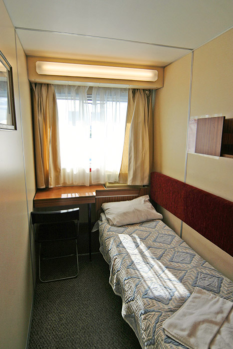 Одноместная каюта со всеми удобствами в на главной палубе. В каюте: одно спальное место, шкаф для одежды, трюмо, радио, душ, санузел, кондиционер, обзорное окно, электророзетка на 220V. Размер кровати 75х190 см. Площадь каюты 6 кв.м. Каюты №: 184, 193, 194, 196.