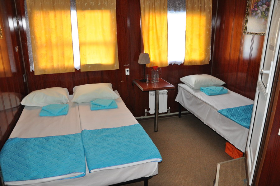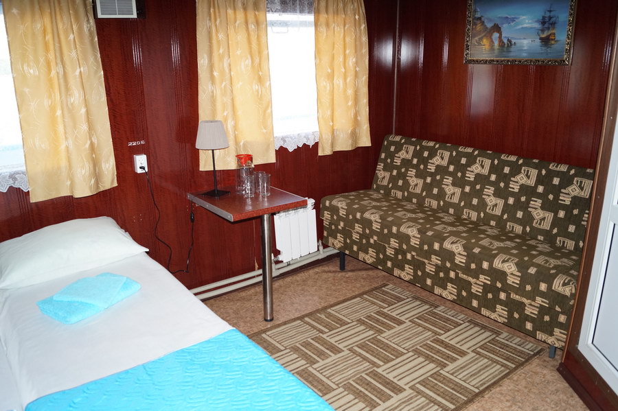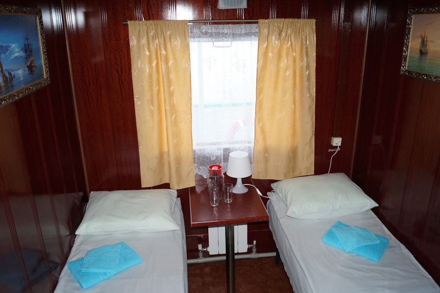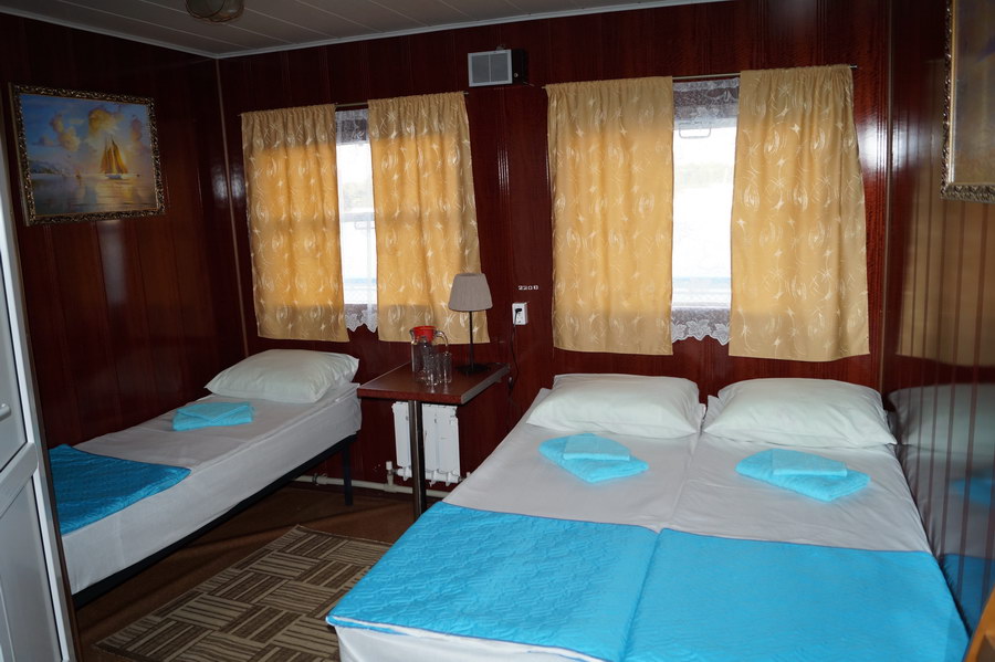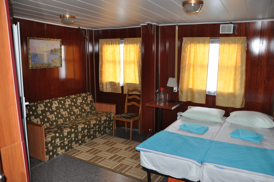 Двухместная каюта повышенной комфортности со всеми удобствами (душ, умывальник, туалет), на средней палубе. В каютах № 9, 10 - две кровати + диван (не раскладывается); № 1, 2, 25 - три кровати, № 27, 34, 36 - двуспальная кровать + односпальная кровать. Во всех каютах электророзетки 220В. Возможно размещение третьего человека на дополнительном месте. Каюты №: 1, 2, 9, 10, 25, 27, 34, 36.