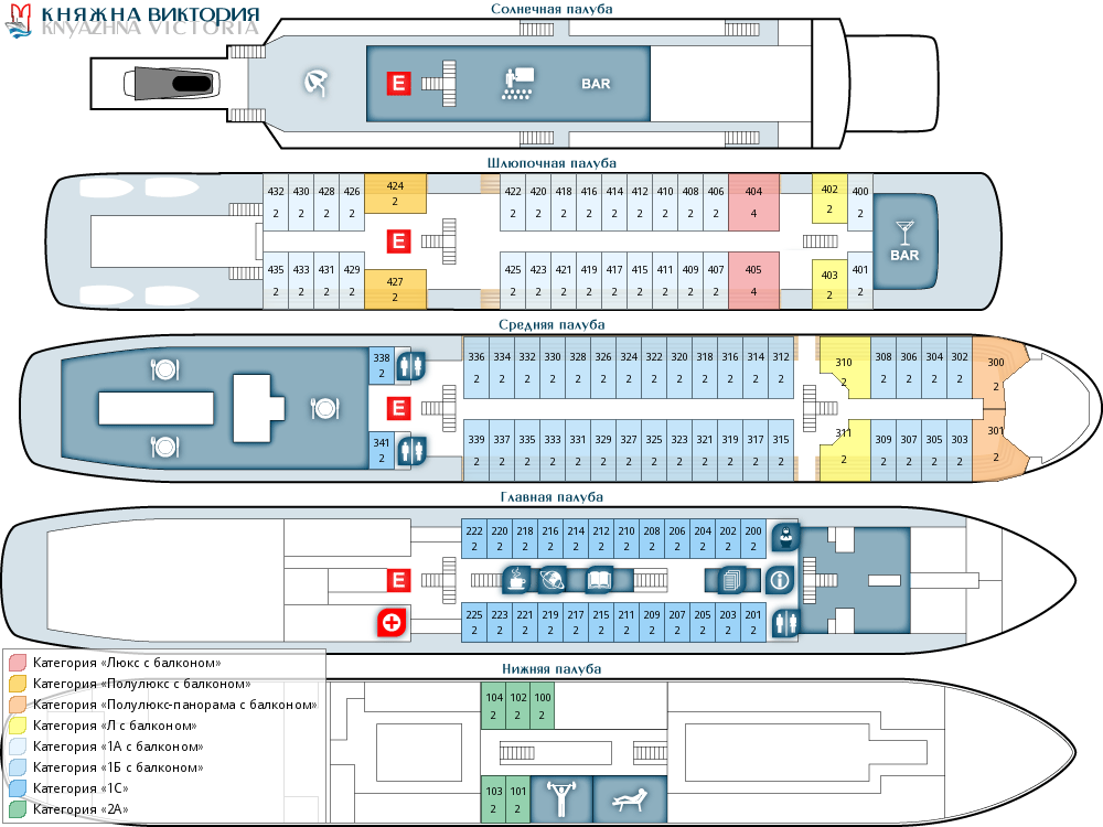 Площадь кают на шлюпочной и средней палубах от 14,5 кв.м. (с учетом балкона 19,3 кв.м.) до 16,7 кв.м. ( с учетом балкона 24,8 кв.м.), на главной палубе – 12,55 кв.м.