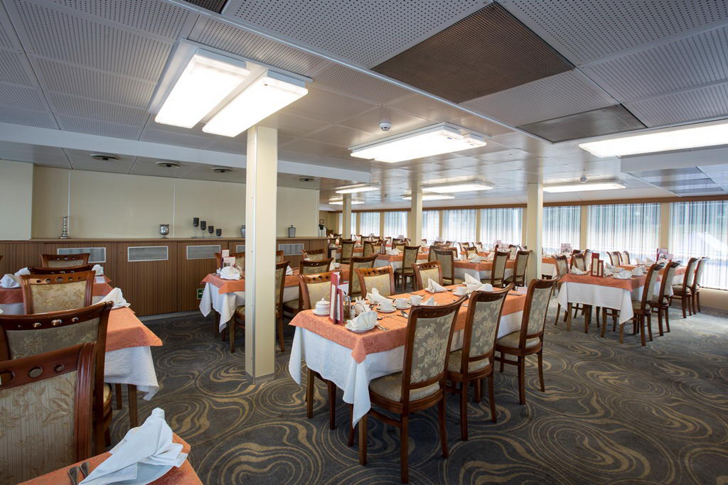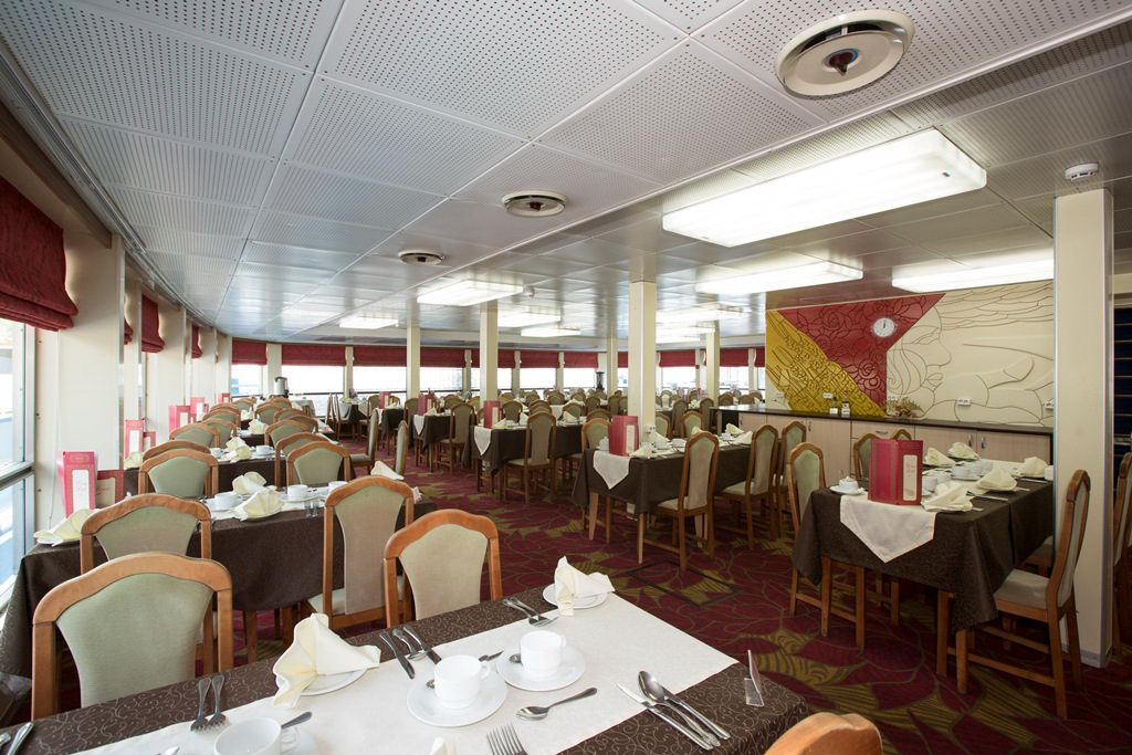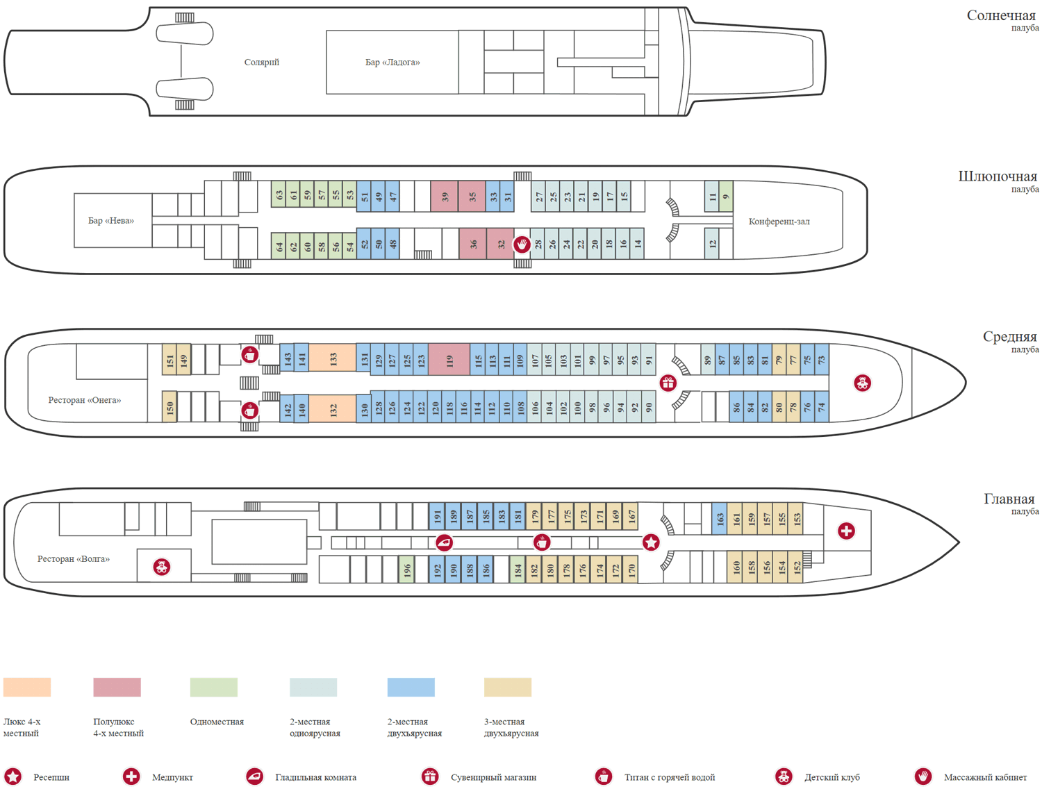 Во всех каютах: шкаф для одежды, радио, кондиционер, душ, санузел, обзорное окно, электророзетка 220V.