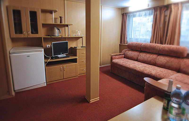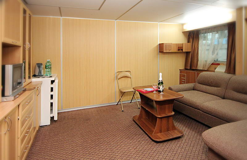 Двухкомнатная каюта с удобствами (душ, санузел, кондиционер), на средней палубе. Каюта рассчитана на размещение от двух до четырех человек. В гостиной: мебельная стенка, диван, раскладывающийся на двоих, кресло, телевизор с DVD, холодильник, радио, два обзорных окна, электророзетка на 220V. В спальне: два спальных места (одно над другим), зеркало. Каюта № 119.