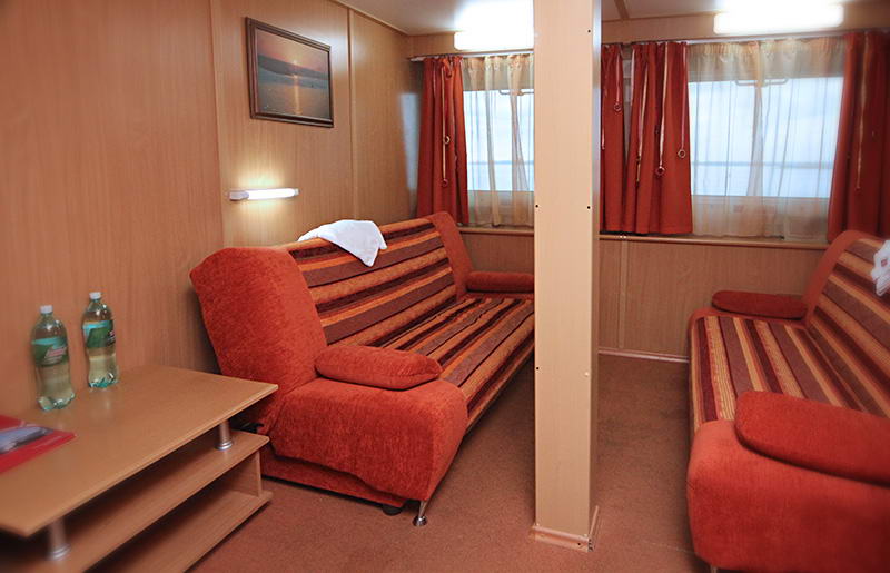 Двухкомнатная каюта с удобствами (душ, санузел, кондиционер), на средней палубе. Каюта рассчитана на размещение от двух до четырех человек. В гостиной: мебельная стенка, раскладывающийся угловой диван, телевизор с DVD, холодильник, радио, два обзорных окна, электророзетка на 220V. В спальне: две односпальные кровати, зеркало, два обзорных окна. Каюты №: 132, 133.
