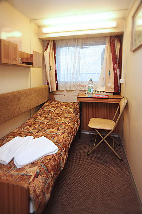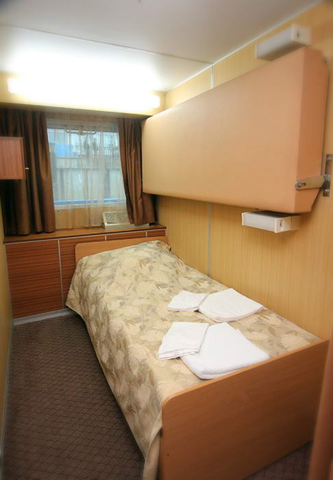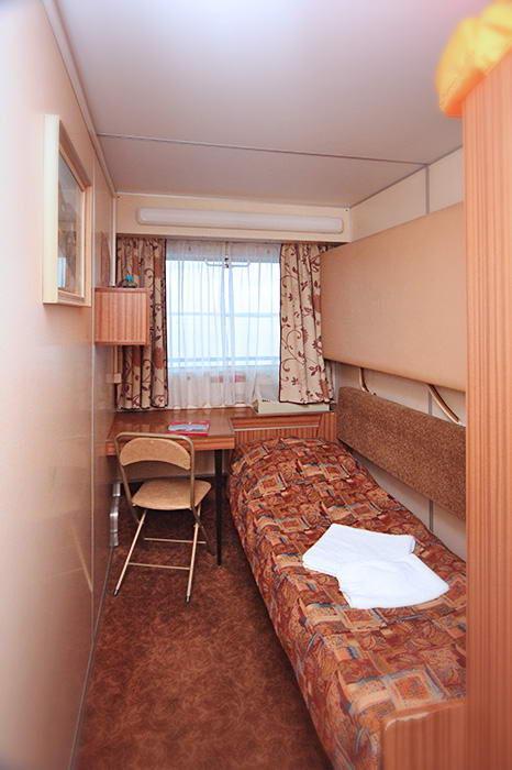 Одноместная каюта со всеми удобствами, на главной палубе. В каюте: одно спальное место, шкаф для одежды, радио, душ, санузел, кондиционер, обзорное окно, зеркало, электророзетка на 220V. Каюты №: 184, 196.