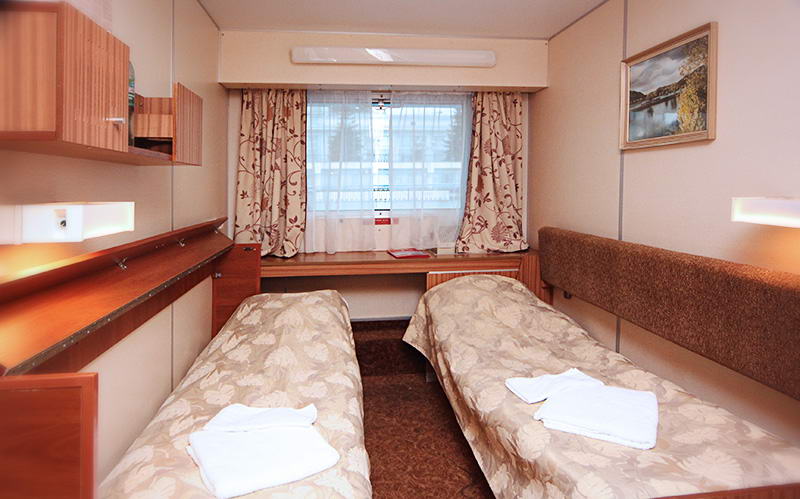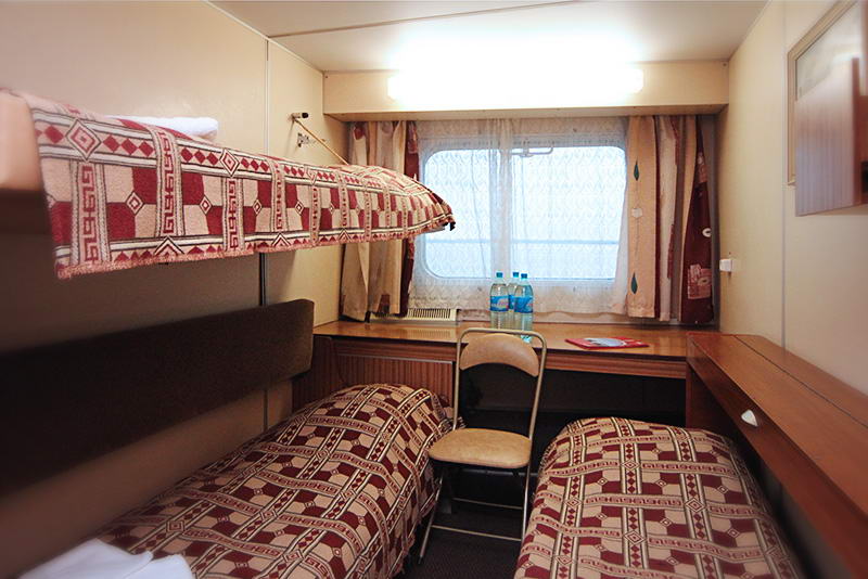 Двухместная двухъярусная каюта со всеми удобствами, на средней палубе. В каюте: два спальных места (одно над другим), шкаф для одежды, зеркало, радио, душ, санузел, кондиционер, обзорное окно, электророзетка на 220V. Каюты №: 73-76, 81-87, 108-116, 118, 120, 122-131, 140-143.