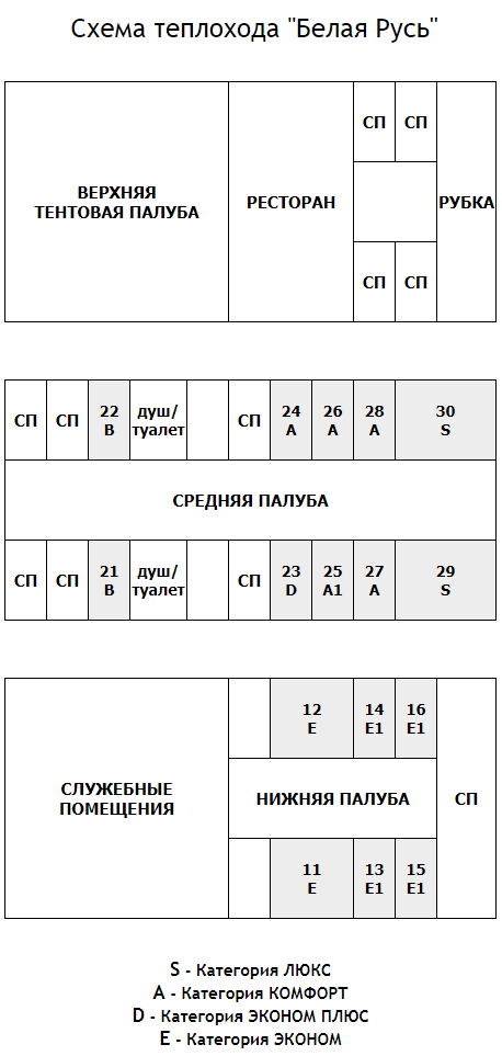 | Примечание: 1 - бронирование кают в 1-местном размещении производится по запросу 2 - бронирование кают № 27, 28 в 2-местном размещении производится только при отсутствии других кают категории А (№ 24, 26) |