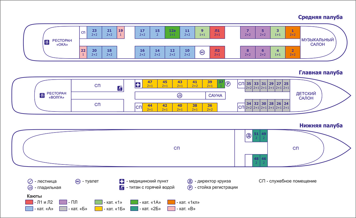 Двухместные каюты увеличенной площади на средней палубе. В каюте: двуспальная кровать, полутороспальный раскладной диван, кресло, журнальный столик, холодильник, кондиционер, телевизор, санузел (душ, туалет, умывальник). Возможно размещение третьего и четвертого человека. Площадь каюты – 19 кв.м. Каюты №: Л1, Л2.